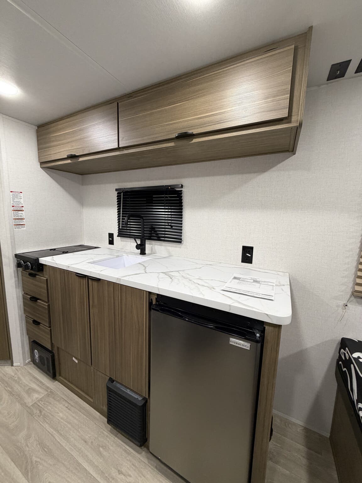 - Exterior: Bumper pull hitch, power awning, ladder, roof deck