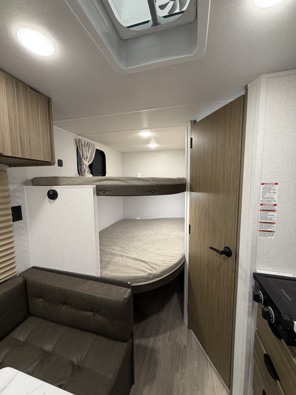 Bunk Beds, Dinette, L Sofa, Queen Bed, Removable Table, Roof Vents, Shower, Toilet