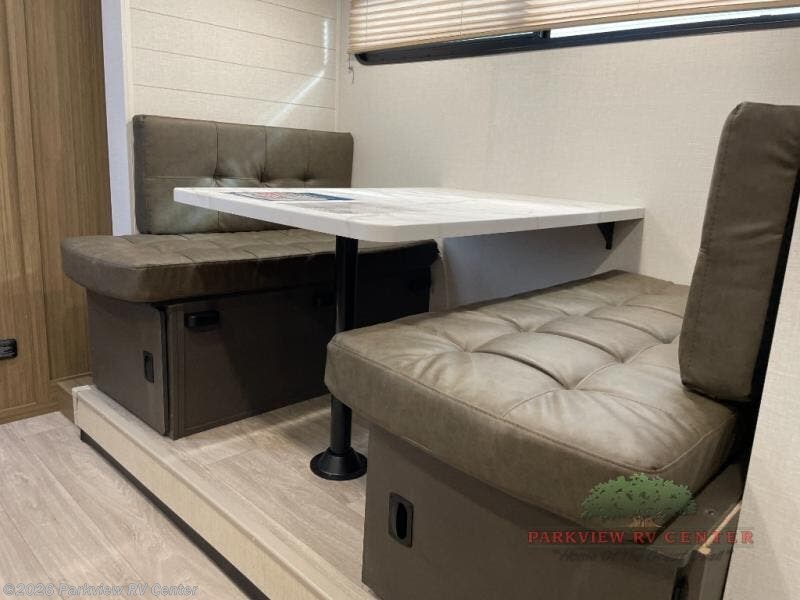 It will be so easy to enjoy time spent in this travel trailer for three. The front queen bed provides a great night's rest, and there is an overhead cabinet to keep your things organized. A two-burner cooktop in the kitchen will let you make meals for your crew, and a refrigerator keeps leftovers fresh. You can dine at the booth dinette within the slide out or take your plate outdoors to sit under the 12' power awning. And a full rear bath with a shower, toilet, and large vanity counter lets you stay clean each day!