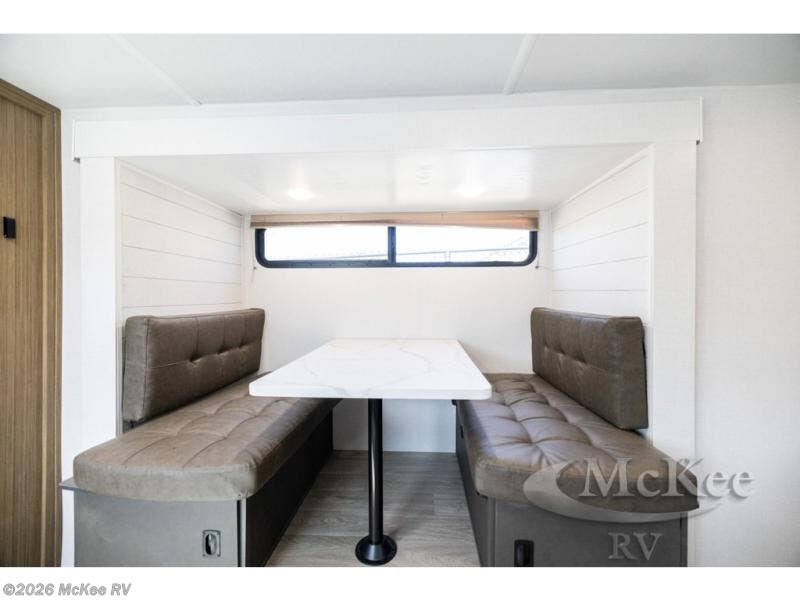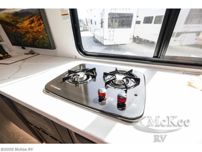 It will be so easy to enjoy time spent in this travel trailer for three. The front queen bed provides a great night's rest, and there is an overhead cabinet to keep your things organized. A two-burner cooktop in the kitchen will let you make meals for your crew, and a refrigerator keeps leftovers fresh. You can dine at the booth dinette within the slide out or take your plate outdoors to sit under the 12' power awning. And a full rear bath with a shower, toilet, and large vanity counter lets you stay clean each day!