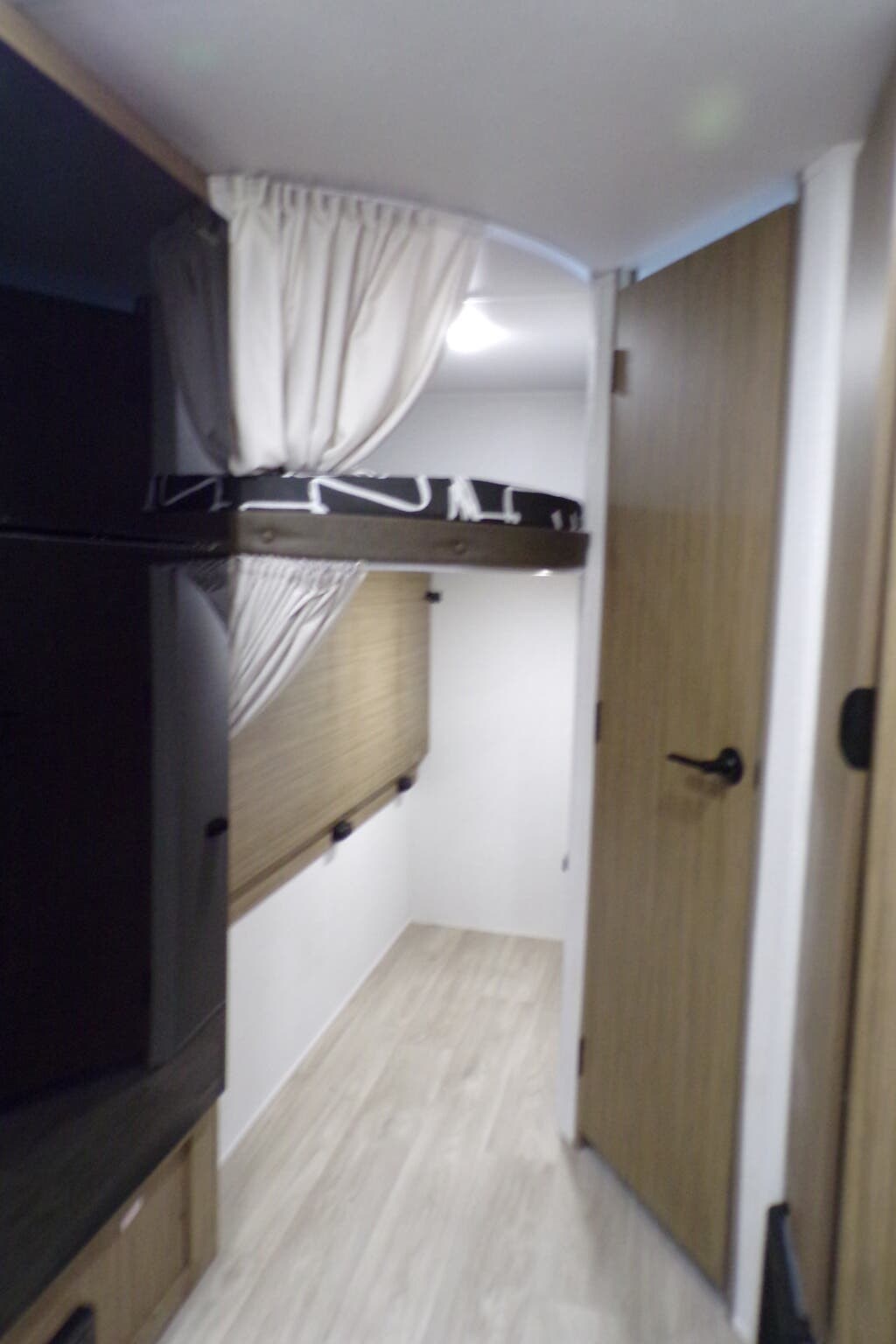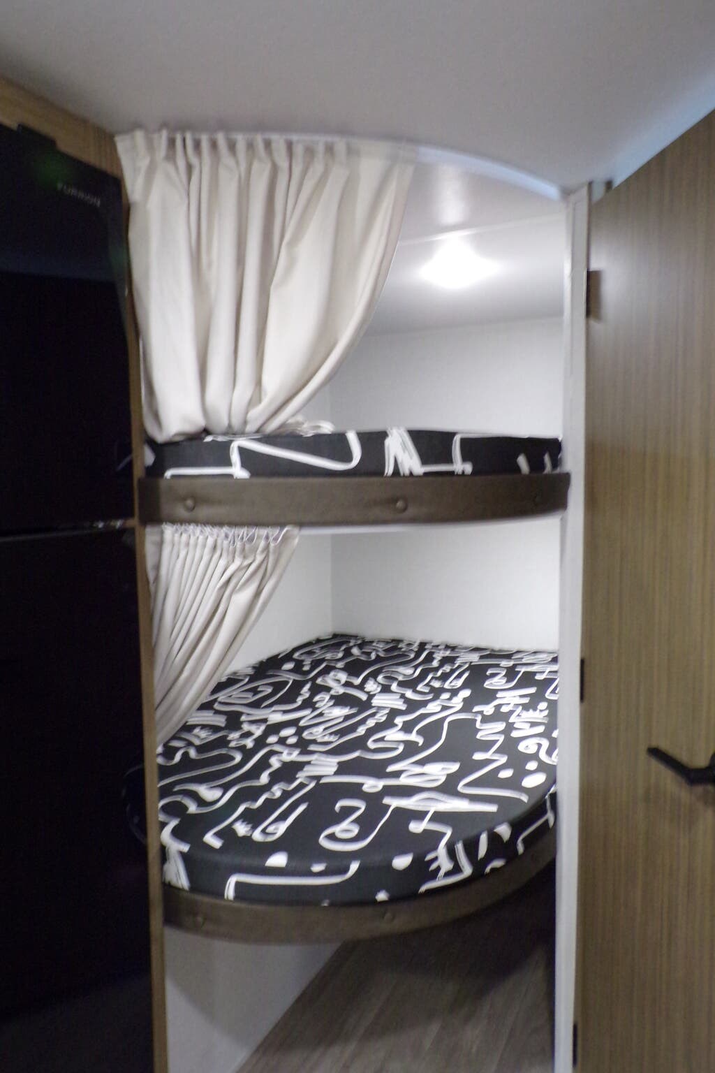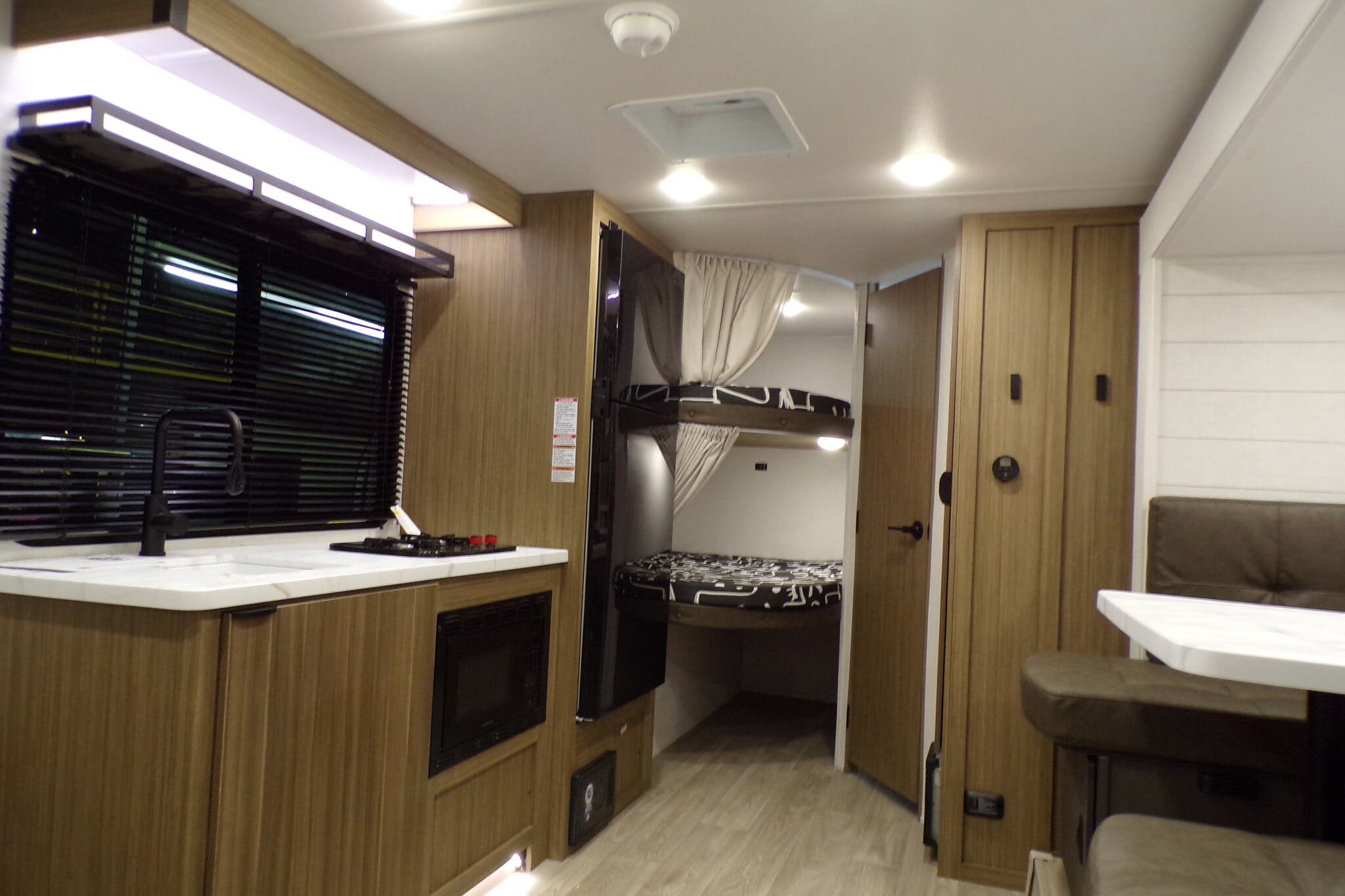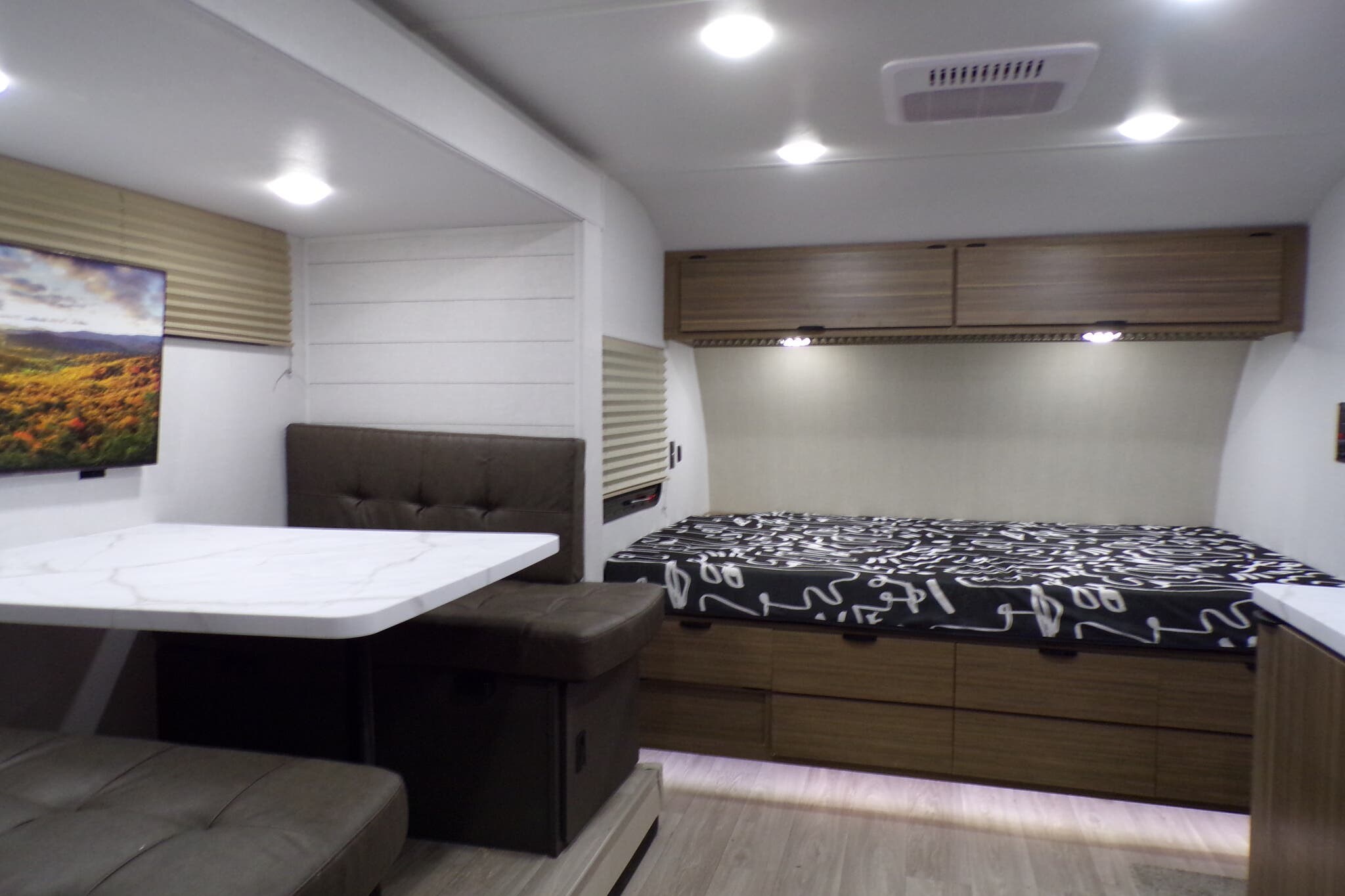 Booth Dinette, Bunk Beds, Dinette, Dinette Bed, Kitchen Sink, Overhead Cabinetry, Pantry, Pleated Shades, Queen Bed, Shower, Toilet