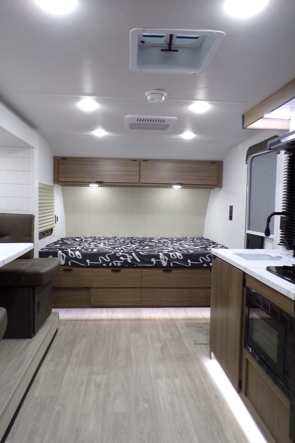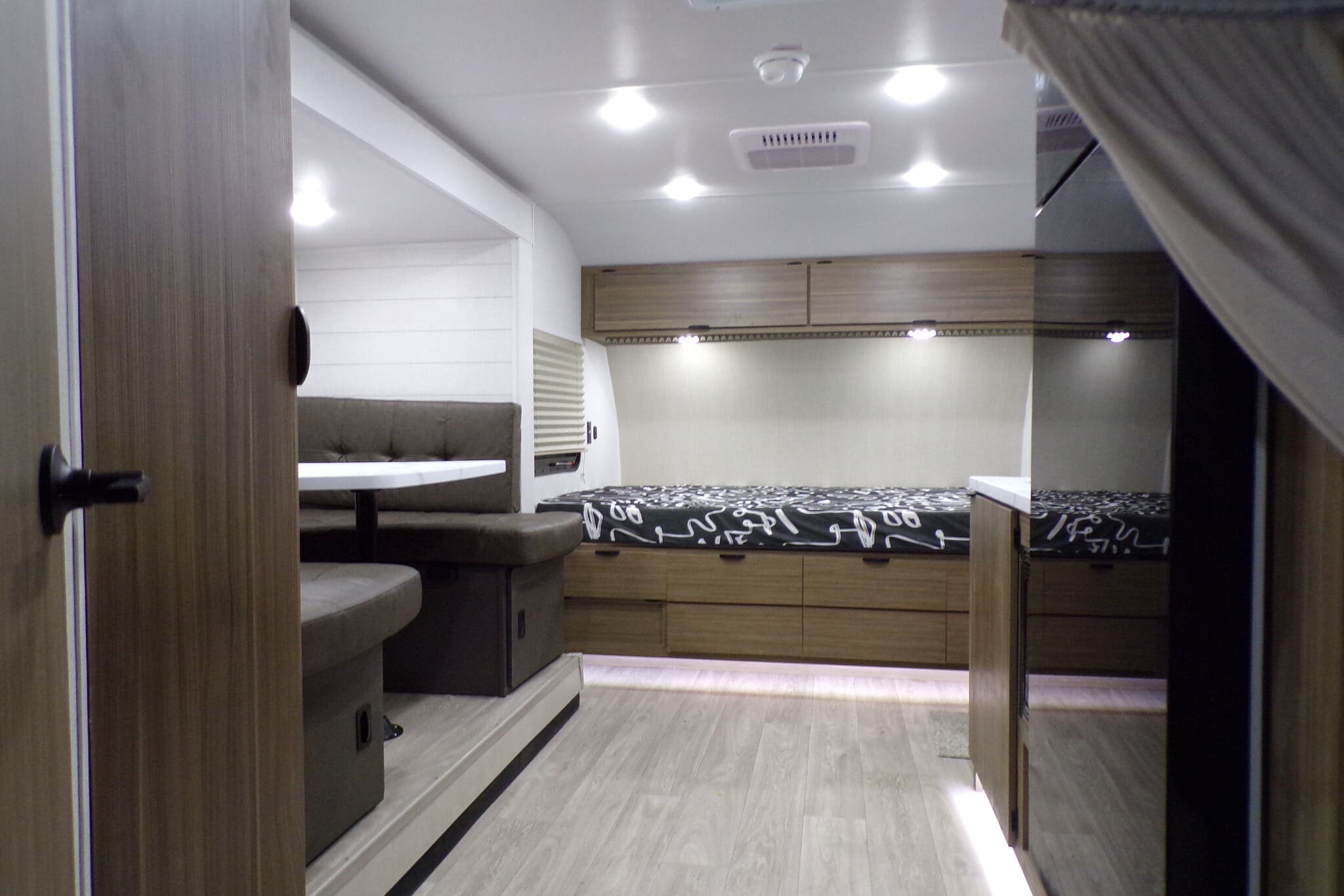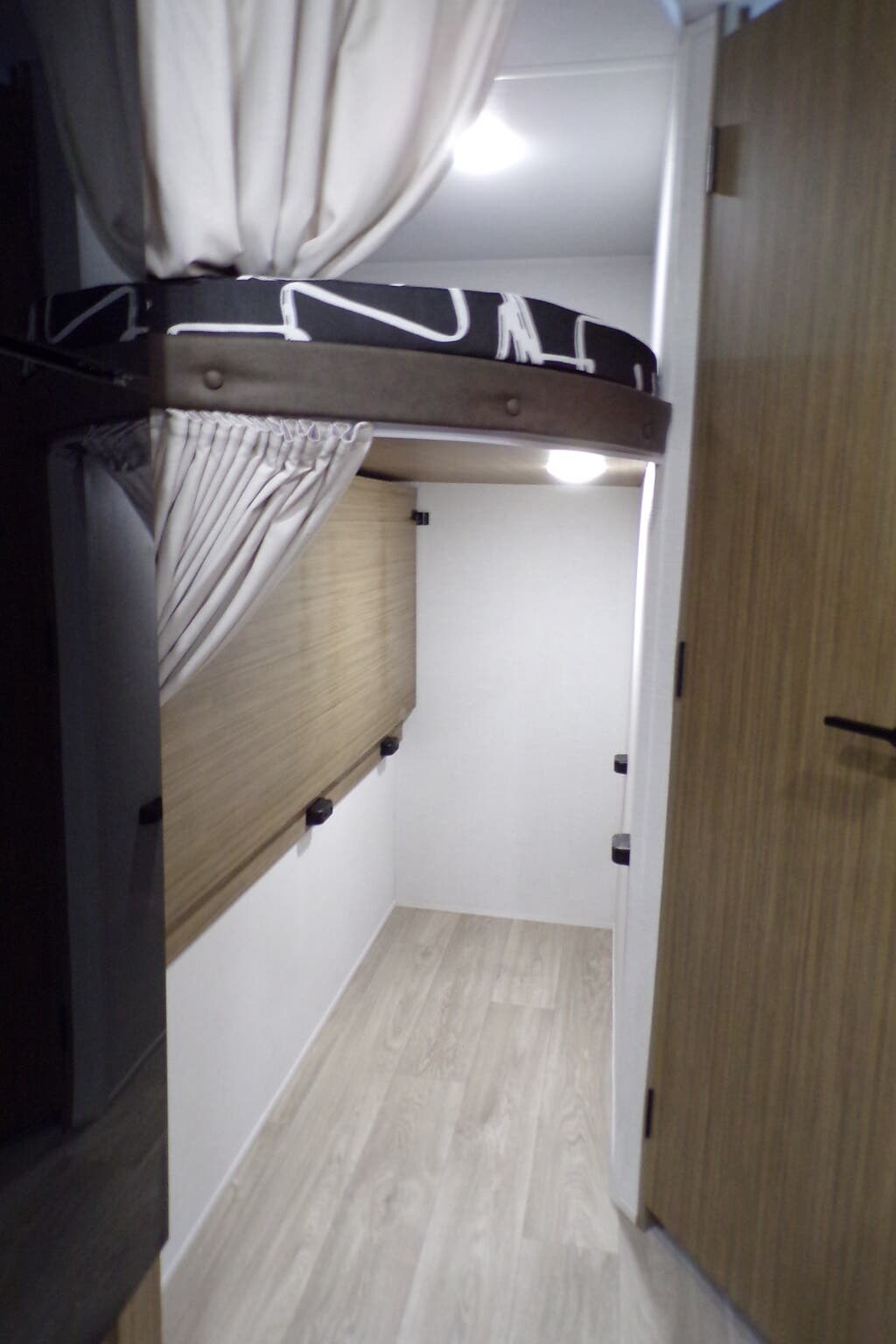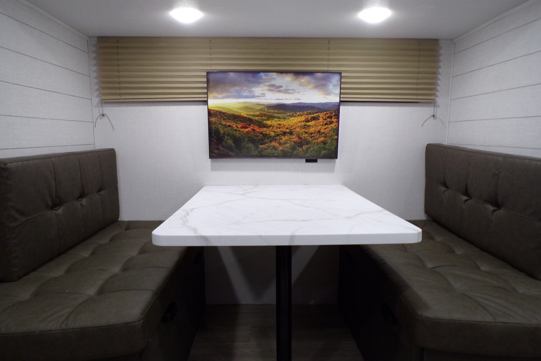 Booth Dinette, Bunk Beds, Dinette, Dinette Bed, Kitchen Sink, Overhead Cabinetry, Pantry, Pleated Shades, Queen Bed, Shower, Toilet