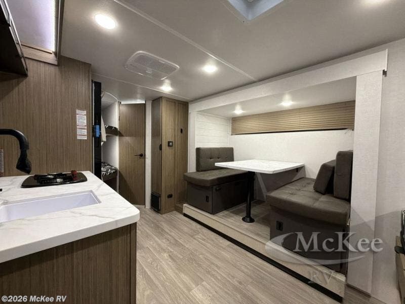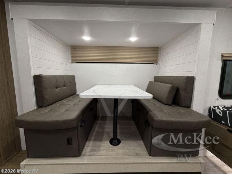 It will be so easy to enjoy time spent in this travel trailer for seven. The front queen bed provides a great night's rest, and there is an overhead cabinet to keep your things organized. Your guests or little ones can claim the double-size bunks for themselves, and there is a full bath adjacent to the bunks for easy nighttime use. A two-burner cooktop in the kitchen will let you make meals for your crew, and a refrigerator keeps leftovers fresh. You can dine at the booth dinette within the slide out or take your plate outdoors to sit under the 15' power awning.