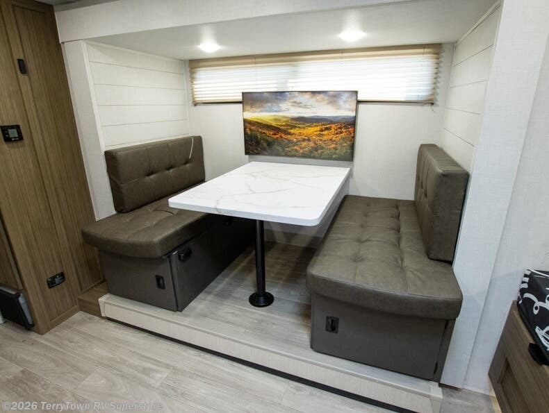 It will be so easy to enjoy time spent in this travel trailer for seven. The front queen bed provides a great night's rest, and there is an overhead cabinet to keep your things organized. Your guests or little ones can claim the double-size bunks for themselves, and there is a full bath adjacent to the bunks for easy nighttime use. A two-burner cooktop in the kitchen will let you make meals for your crew, and a refrigerator keeps leftovers fresh. You can dine at the booth dinette within the slide out or take your plate outdoors to sit under the 15' power awning.