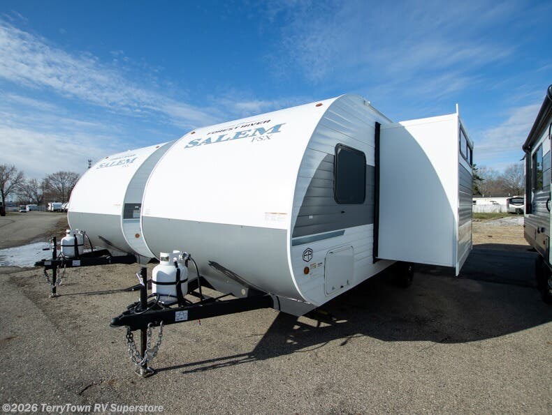 The Forest River Salem FSX travel trailers and toy hauler travel trailers are ultra comfortable and lightweight, perfect for first time or seasoned campers alike! You will love how easy it will be to relax with residential features that will make your space feel just like home, and the durable construction means you can enjoy your RV for years to come. There are a wide variety of floorplans to choose from, including couple's trailers, bunk models, and toy haulers, all with full bath and kitchen amenities and plenty of storage for all your gear!