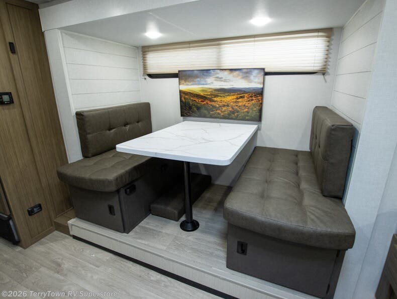It will be so easy to enjoy time spent in this travel trailer for seven. The front queen bed provides a great night's rest, and there is an overhead cabinet to keep your things organized. Your guests or little ones can claim the double-size bunks for themselves, and there is a full bath adjacent to the bunks for easy nighttime use. A two-burner cooktop in the kitchen will let you make meals for your crew, and a refrigerator keeps leftovers fresh. You can dine at the booth dinette within the slide out or take your plate outdoors to sit under the 15' power awning.