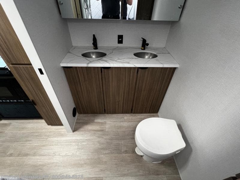 Camping is made easy in this travel trailer with at-home comforts! You'll have the front private bedroom with a king bed all to yourselves, and there are dual bedroom wardrobes to keep your space neat and clean. Any additional guests can sleep on the super lounge with a removable table. You will appreciate the full rear bath complete with a linen closet and dual bath sinks so you both can get ready for bed at once. And a full kitchen lets you whip up your best meals!