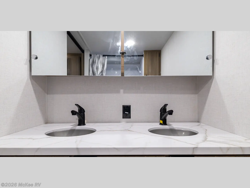 Camping is made easy in this travel trailer with at-home comforts! You'll have the front private bedroom with a king bed all to yourselves, and there are dual bedroom wardrobes to keep your space neat and clean. Any additional guests can sleep on the super lounge with a removable table. You will appreciate the full rear bath complete with a linen closet and dual bath sinks so you both can get ready for bed at once. And a full kitchen lets you whip up your best meals!