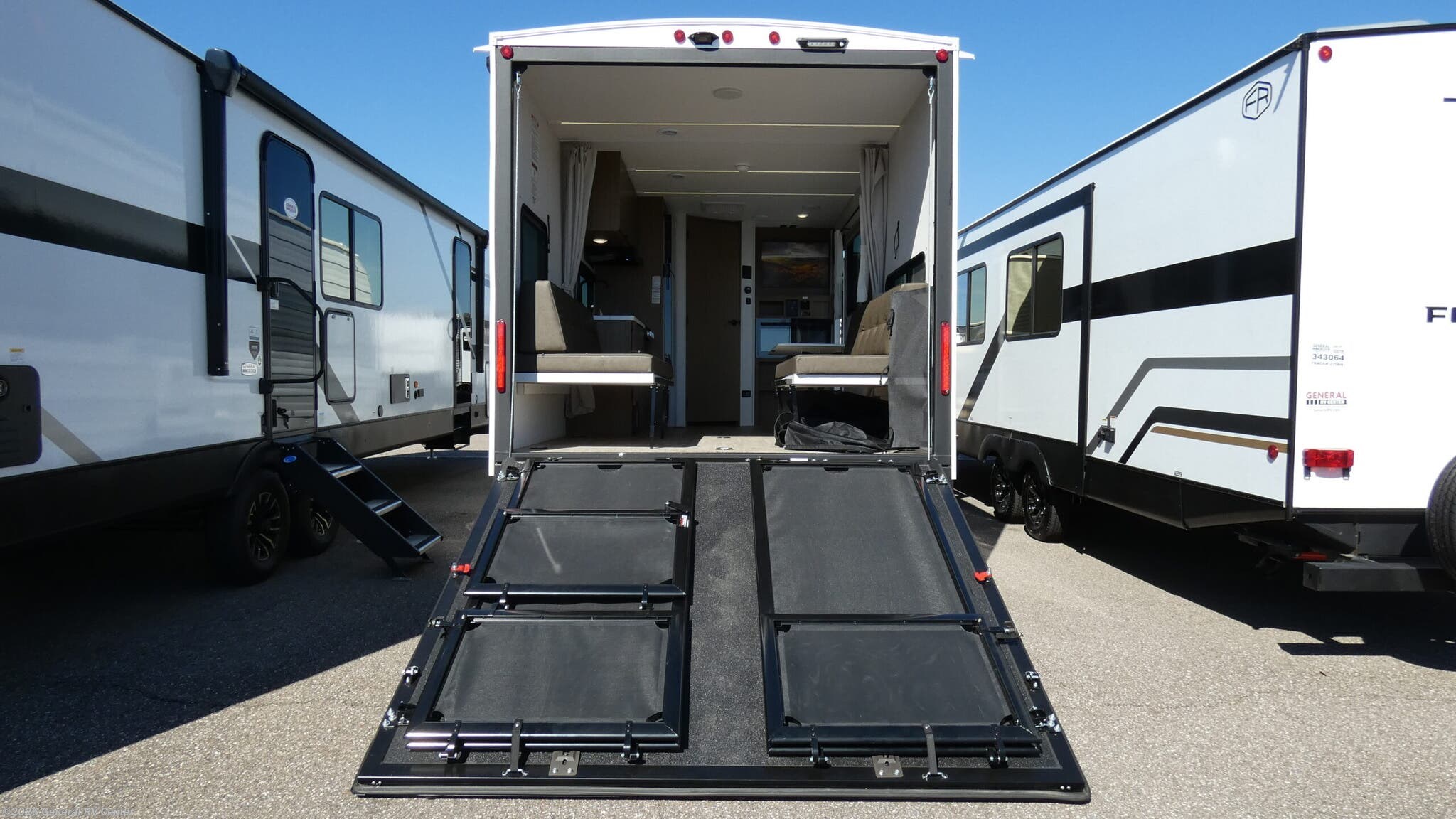 Forest River Salem FSX Platinum MAX Series toy hauler 260RTKX highlights: Front Private Bedroom Walk-Through Bathroom Fireplace Outside Shower Full Pass-Through Storage Smooth Fiberglass Exterior You will feel right at home in this toy hauler! The front private bedroom has a king bed to lay your head on at night with wardrobes on either side of it for your clothes. You even have access to the walk-through bathroom which has a neo-angled shower. Prepare your best home cooked meals with the 3-in-1 cooker with a convection oven and three burner cooktop, enjoy them at the opposing 30" x 72" sofa sleepers with a table in between, and store any leftovers in the 12V refrigerator. The 90" x 75", 3,000 lb. ramp door doubles as a party patio with a 1,500 lb. max weight capacity so you can invite your neighboring campers to join in on the fun! The Forest River Salem FSX travel trailers and toy hauler travel trailers are ultra comfortable and lightweight, perfect for first time or seasoned campers alike! You will love how easy it will be to relax with residential features that will make your space feel just like home, and the durable construction and easy to maintain fiberglass exterior means you can enjoy your RV for years to come. There are a wide variety of floorplans to choose from, including couple's trailers, bunk models, and toy haulers, all with full bath and kitchen amenities and plenty of storage for all your gear!