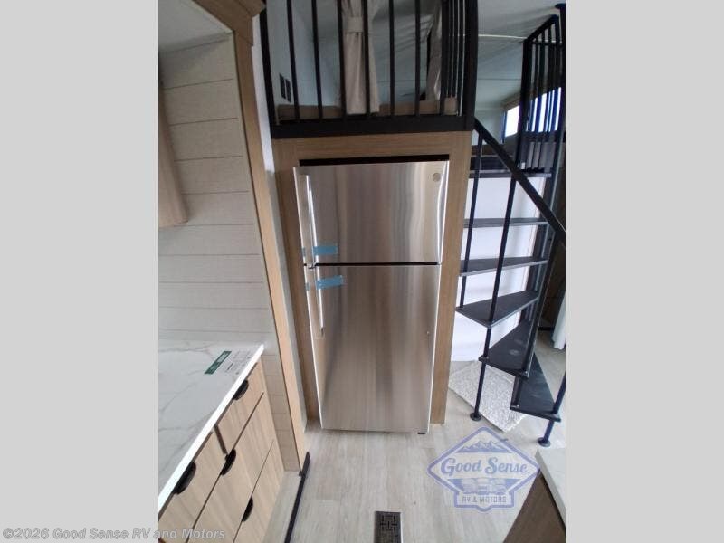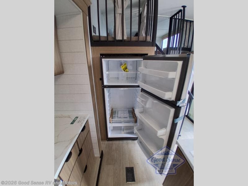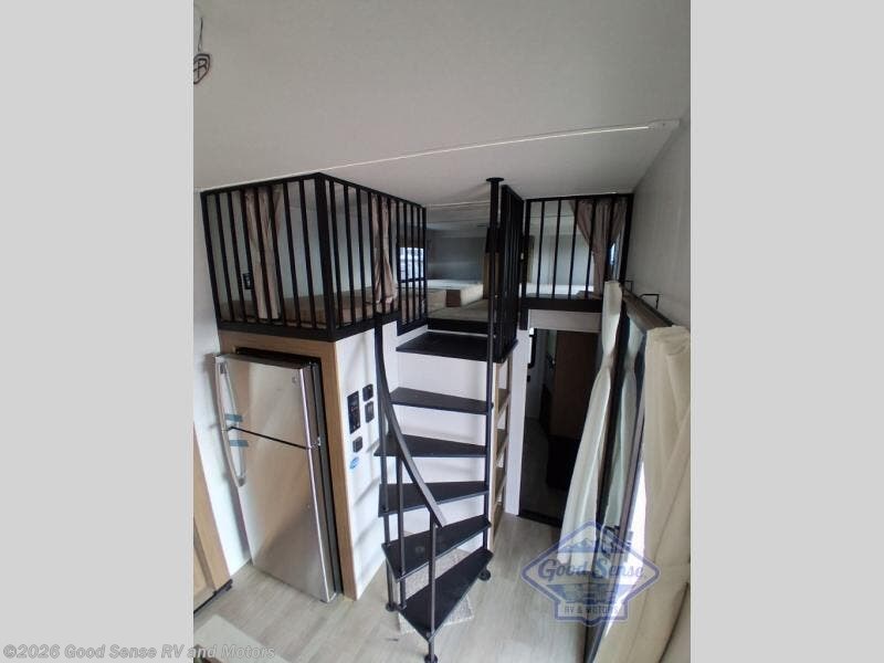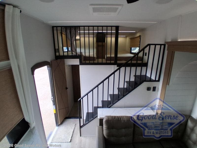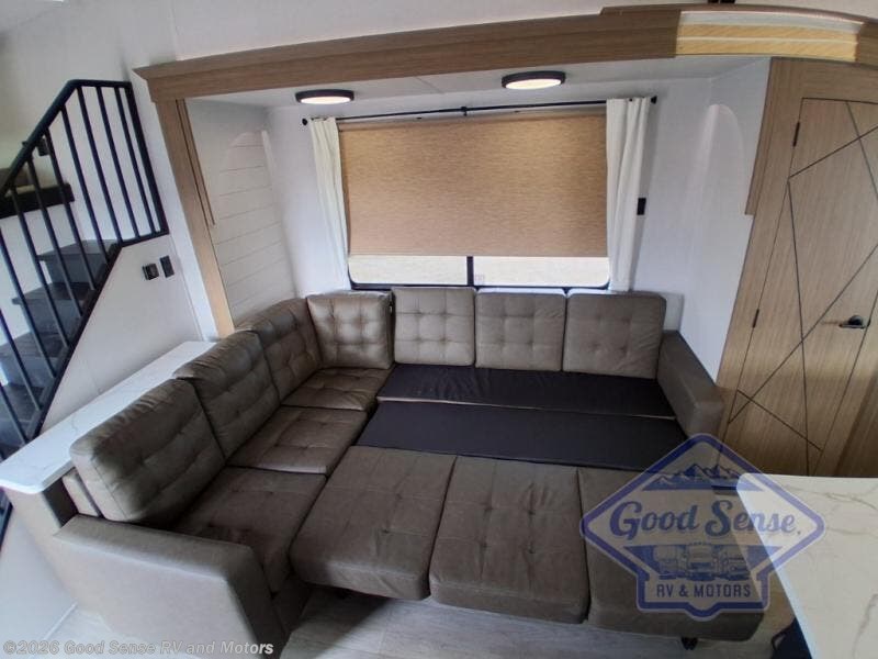 This trailer is built with comfort and convenience in mind, offering plenty of sleeping space for the whole gang. It has two spacious lofts, each equipped with two 42" x 72" bunk mats, plus an extra 36" x 38" bunk mat, providing cozy sleeping spots for everyone. Each loft also includes built-in storage for essentials, and instead of climbing a ladder, easy stair access makes getting in and out much safer. On the main floor, you’ll find a full rear bathroom with a walk-in shower and washer/dryer prep. The main living area has a large sectional sofa, perfect for gathering the group to watch the TV on the Televator or relaxing by the fireplace after a day outdoors. The kitchen is equipped with all the essentials, including a large pantry, overhead cabinets for snack storage, a fridge, and a kitchen island that adds prep space. Up front, the private bedroom has a king bed with Versa Tilt, a dresser, and shelves to keep your clothes and camp gear neatly organized. Regardless that you're adventuring about, this trailer is ready to make every trip feel like home.