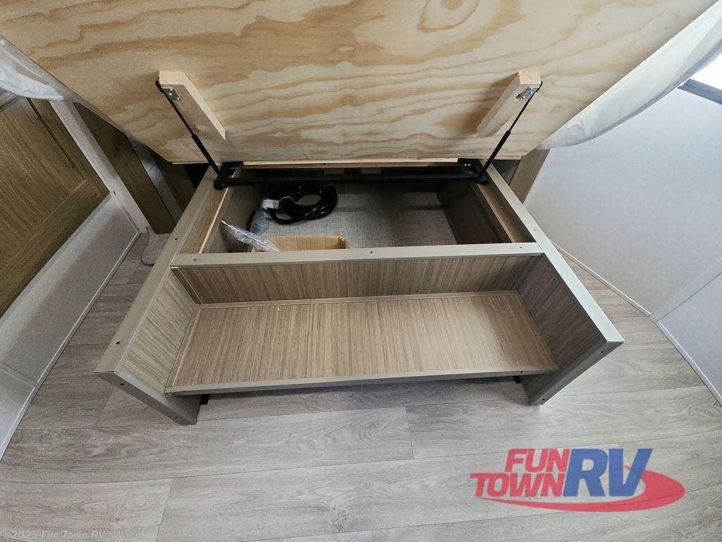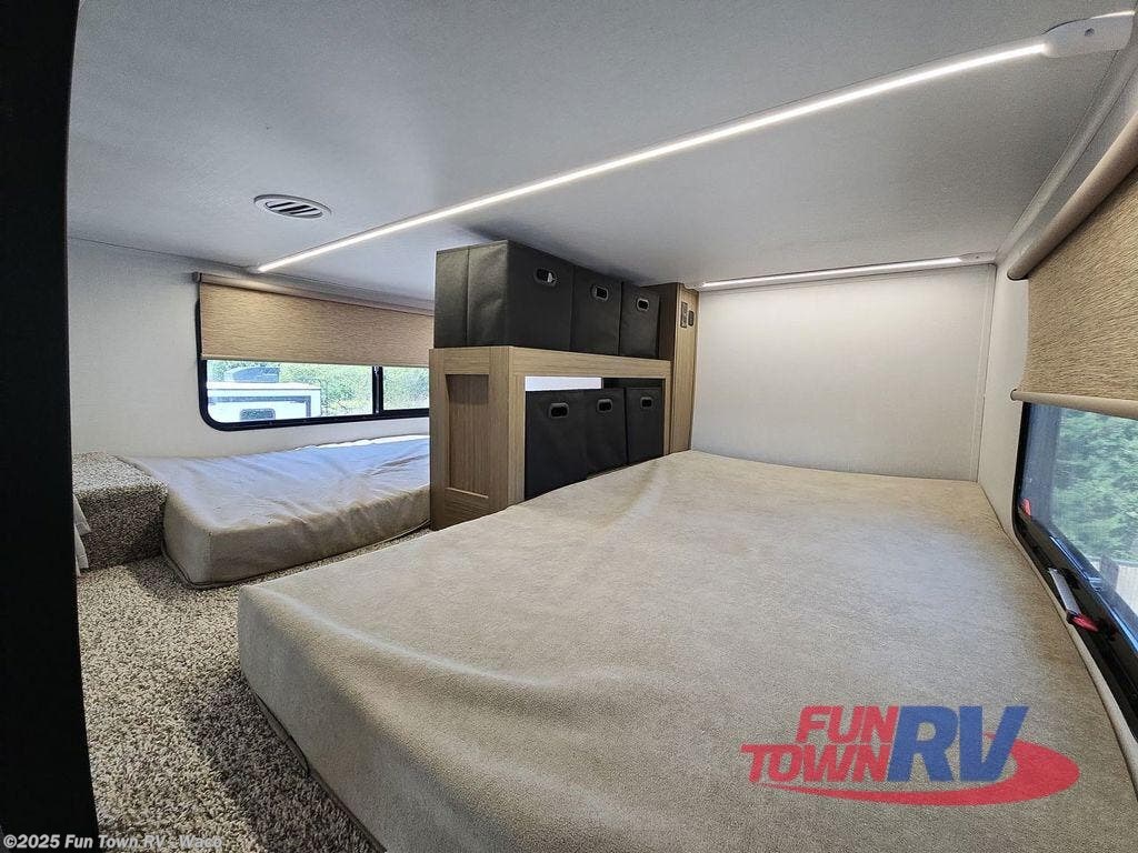 This trailer is built with comfort and convenience in mind, offering plenty of sleeping space for the whole gang. It has two spacious lofts, each equipped with two 42" x 72" bunk mats, plus an extra 36" x 38" bunk mat, providing cozy sleeping spots for everyone. Each loft also includes built-in storage for essentials, and instead of climbing a ladder, easy stair access makes getting in and out much safer. On the main floor, you’ll find a full rear bathroom with a walk-in shower and washer/dryer prep. The main living area has a large sectional sofa, perfect for gathering the group to watch the TV on the Televator or relaxing by the fireplace after a day outdoors. The kitchen is equipped with all the essentials, including a large pantry, overhead cabinets for snack storage, a fridge, and a kitchen island that adds prep space. Up front, the private bedroom has a king bed with Versa Tilt, a dresser, and shelves to keep your clothes and camp gear neatly organized. Regardless that you're adventuring about, this trailer is ready to make every trip feel like home.