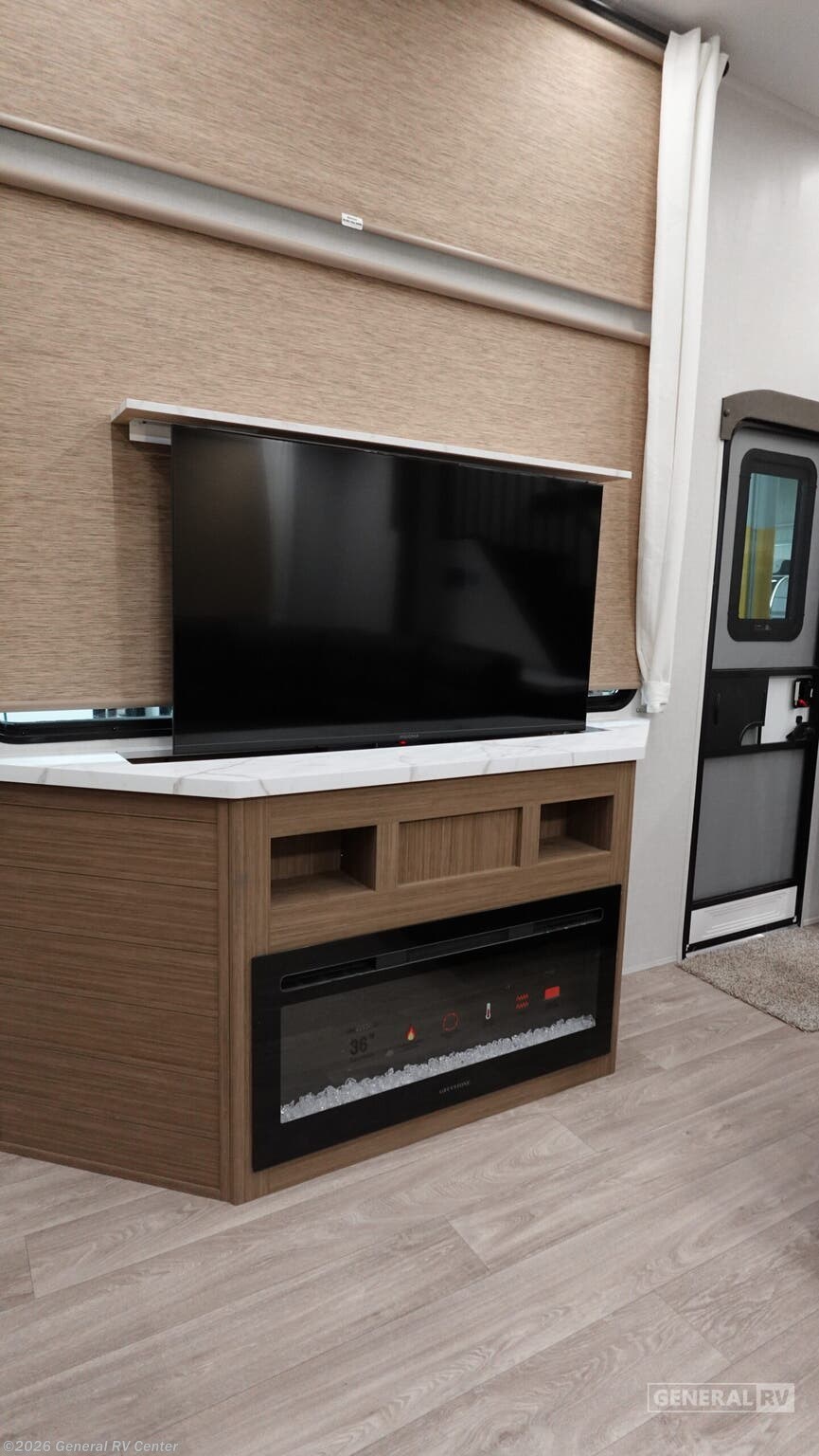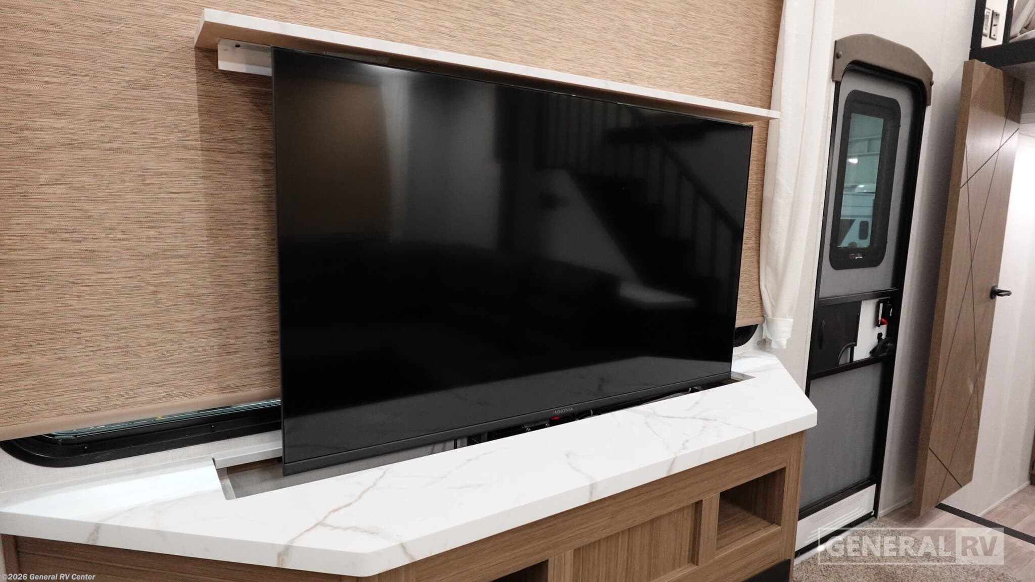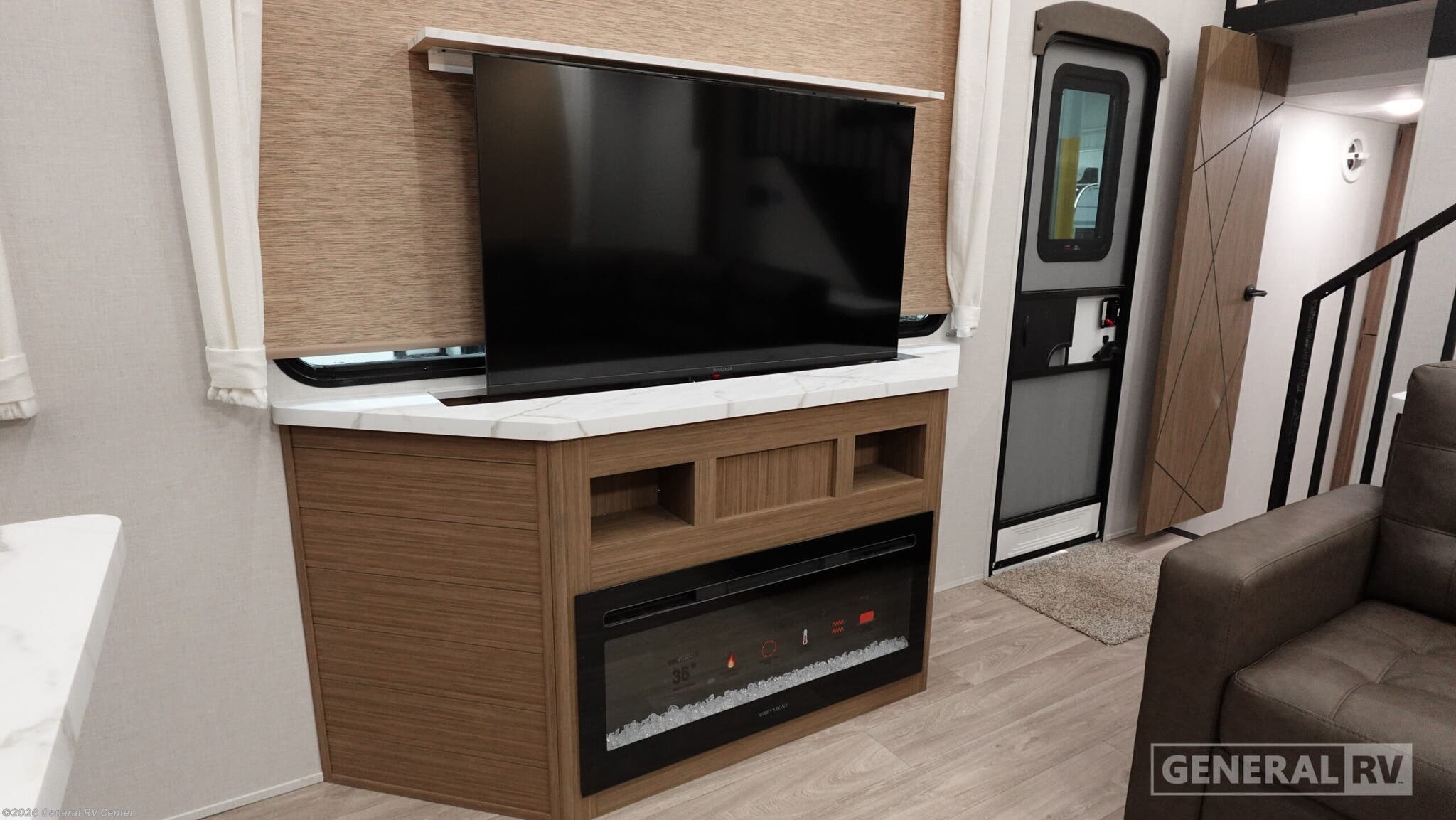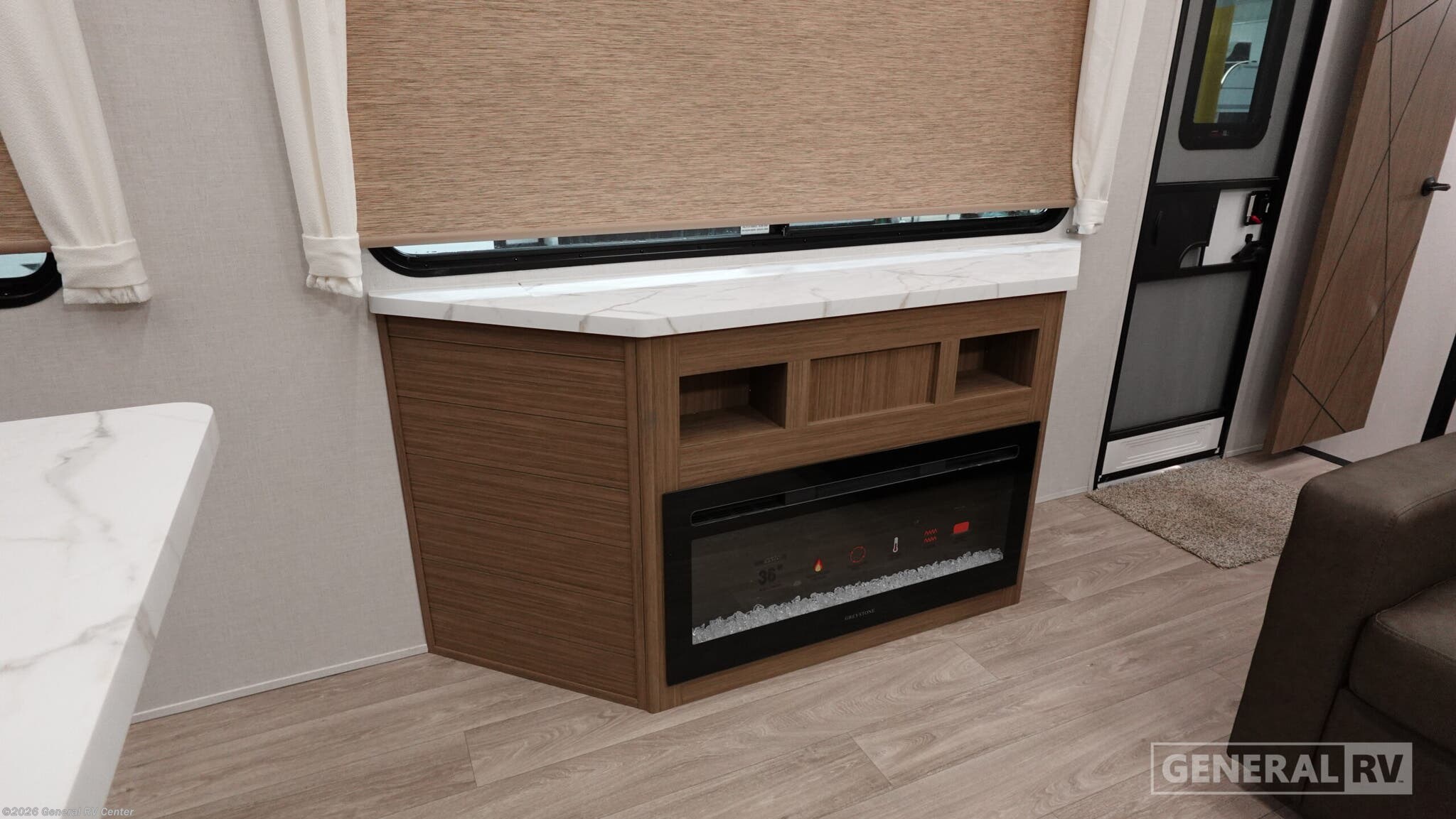 Discover the ultimate in comfort and style with the 2026 Forest River Salem Grand Villa 42ICE. This spacious RV is designed for families and adventurers alike, offering ample room for up to seven sleepers. Its expansive 45-foot length is crafted to provide a luxurious home-away-from-home experience. The centerpiece is the elegant living area featuring a sectional sofa and a cozy fireplace, perfect for relaxing after a day of exploration. The innovative Tele-Vator ensures your entertainment needs are met with a touch of modern flair. Venture into the well-appointed kitchen, where you'll find abundant counter space and storage, making meal prep a breeze. The king bed with Versa Tilt in the master suite promises restful nights, while the loft area, complete with bunk mats and storage, is perfect for the kids or guests. With a walk-in shower and washer/dryer prep, this RV combines practicality with luxury. Enjoy the great outdoors under the generous awning, making every moment memorable. For more details, visit your nearest General RV dealership.