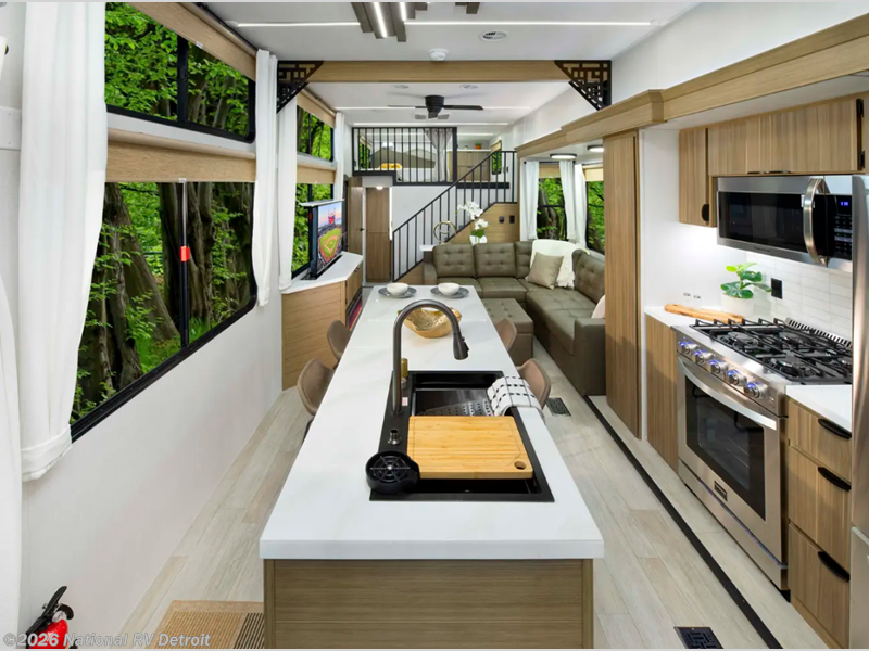 This thoughtfully designed 42ZEN model provides a blend of comfort and functionality. It features two lofts for added sleeping and living space, one includes a 62" x 74" Versa queen mattress and a dresser for storing clothes and essentials, while the second loft offers another Versa queen bed, plus a table with recessed footing, perfect for getting work or study done on the road. There is also a cabinet and shelf to keep everything organized. On the main floor, you'll find a large rear full bathroom, complete with a walk-in shower, linen closet, and washer/dryer prep, providing all the comforts of home. The main living area centers around a large sectional sofa with room for the whole crew, facing a fireplace and Televator TV, making it the perfect space to relax after a long day. The kitchen island also adds valuable prep space and also serves as a gathering spot with room for stools. Up front, the master bedroom features a king-size bed with Versa Tilt, a dresser, and its own private bathroom, offering convenience and privacy whenever you need it.