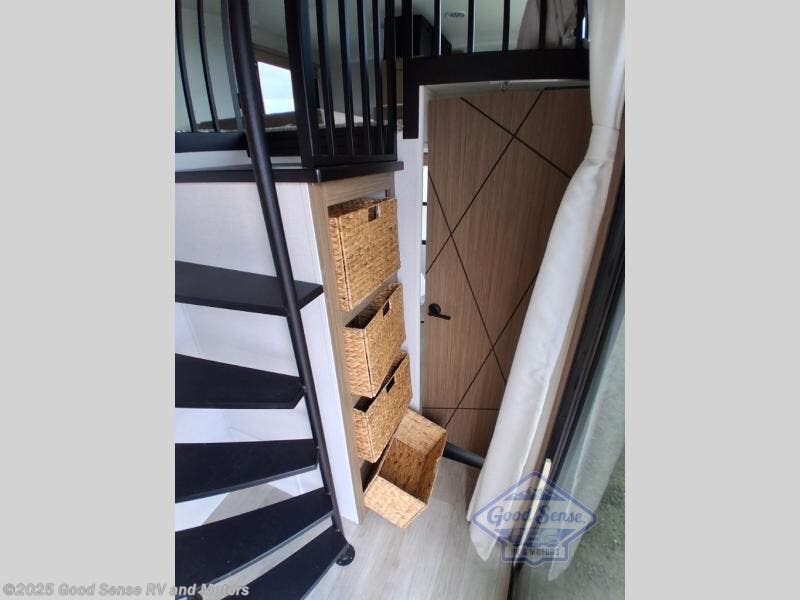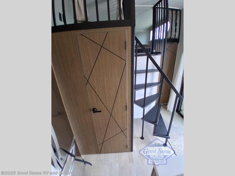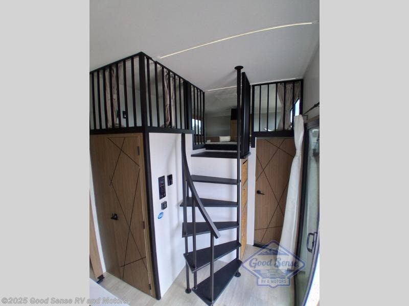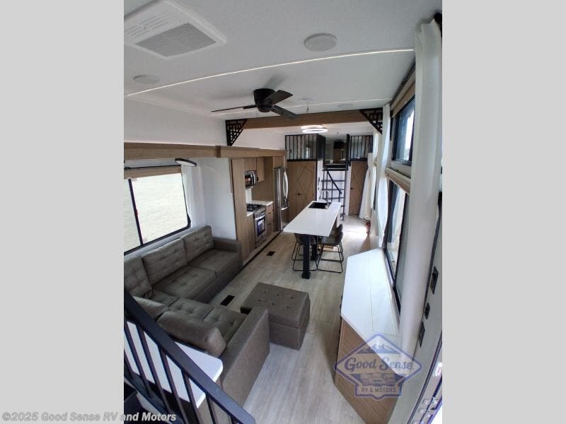 This 44ZEN trailer is designed to offer maximum comfort and space. It features two lofts that adds extra sleeping space, one includes a 62" x 74" Versa queen mattress and a dresser for personal items, while the second loft comes with a Versa queen bed, shelf and cabinet storage, and a table with recessed footing, perfect for remote work or study sessions. On the main floor, the rear full bathroom is fully equipped with a walk-in shower, linen closet, and washer/dryer prep. At the center we have a large sectional sofa invites everyone to gather, facing a fireplace and Televator TV, great for movie nights or relaxing. The kitchen island adds prep space but also doubles as a casual dining area with barstool seating. For added convenience, a half bath is tucked beside the second stairway, providing easy access if needed. Up front, the master bedroom offers a retreat with a king-size bed with Versa Tilt, a dresser for storage, and a wall of windows that provides a view of the scenery outside.