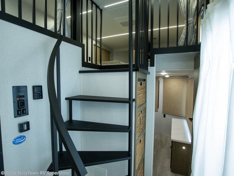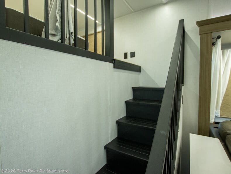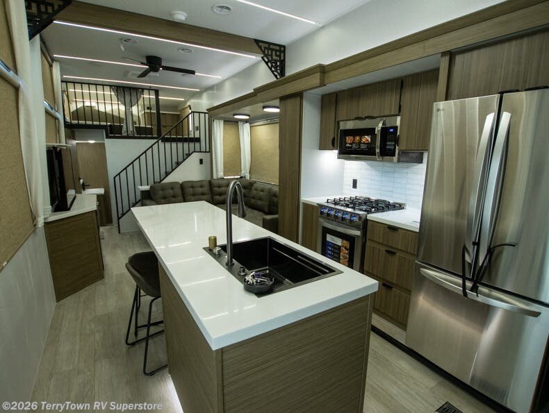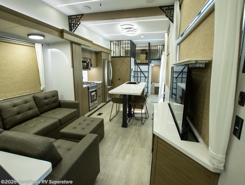 This 44ZEN trailer is designed to offer maximum comfort and space. It features two lofts that adds extra sleeping space, one includes a 62" x 74" Versa queen mattress and a dresser for personal items, while the second loft comes with a Versa queen bed, shelf and cabinet storage, and a table with recessed footing, perfect for remote work or study sessions. On the main floor, the rear full bathroom is fully equipped with a walk-in shower, linen closet, and washer/dryer prep. At the center we have a large sectional sofa invites everyone to gather, facing a fireplace and Televator TV, great for movie nights or relaxing. The kitchen island adds prep space but also doubles as a casual dining area with barstool seating. For added convenience, a half bath is tucked beside the second stairway, providing easy access if needed. Up front, the master bedroom offers a retreat with a king-size bed with Versa Tilt, a dresser for storage, and a wall of windows that provides a view of the scenery outside.