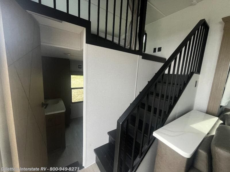 This 44ZEN trailer is designed to offer maximum comfort and space. It features two lofts that adds extra sleeping space, one includes a 62" x 74" Versa queen mattress and a dresser for personal items, while the second loft comes with a Versa queen bed, shelf and cabinet storage, and a table with recessed footing, perfect for remote work or study sessions. On the main floor, the rear full bathroom is fully equipped with a walk-in shower, linen closet, and washer/dryer prep. At the center we have a large sectional sofa invites everyone to gather, facing a fireplace and Televator TV, great for movie nights or relaxing. The kitchen island adds prep space but also doubles as a casual dining area with barstool seating. For added convenience, a half bath is tucked beside the second stairway, providing easy access if needed. Up front, the master bedroom offers a retreat with a king-size bed with Versa Tilt, a dresser for storage, and a wall of windows that provides a view of the scenery outside.