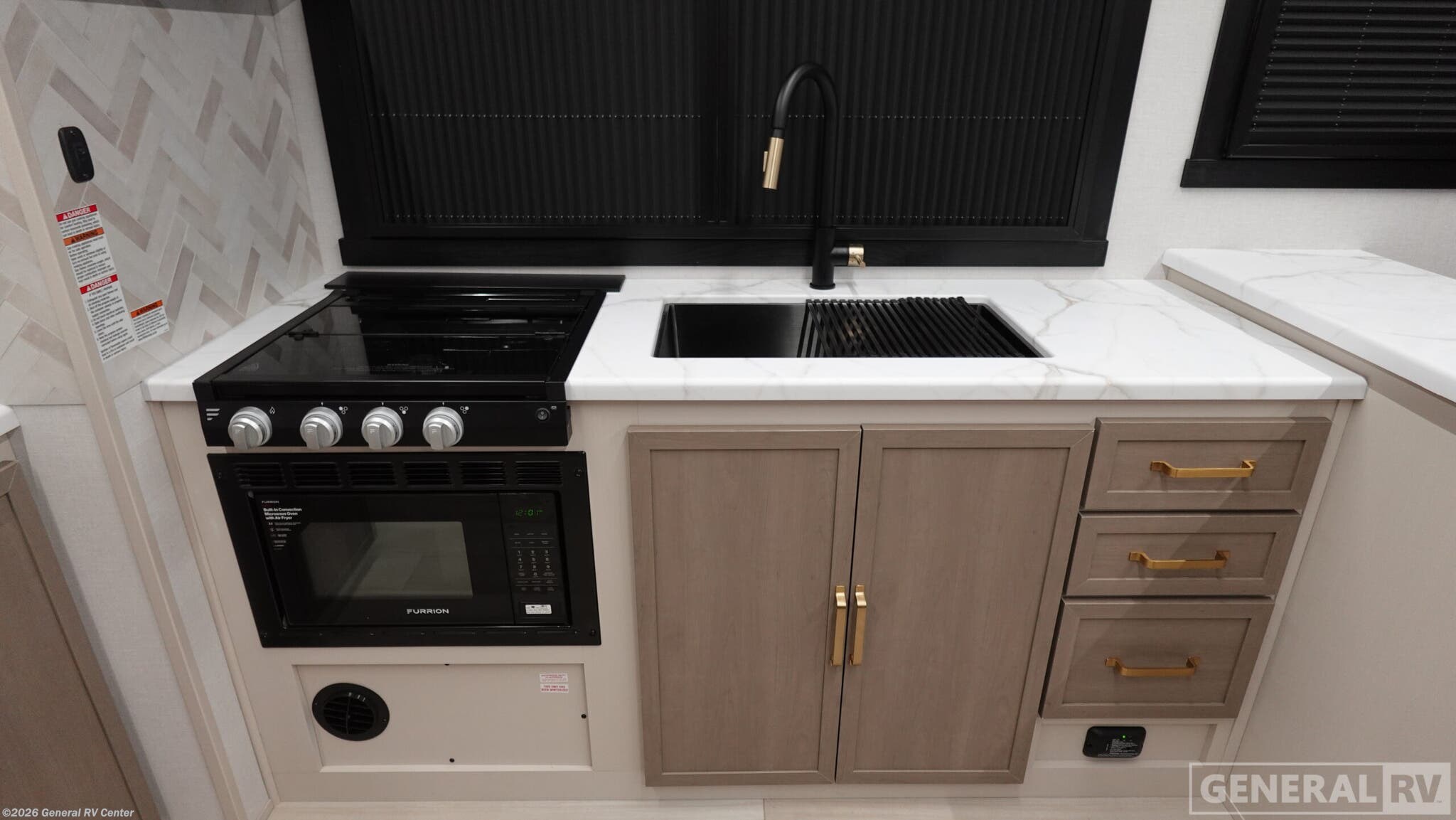Wildwood Heritage Glen Hyper-Lyte travel trailer 24RBHL highlights: Front Master Bedroom Theater Seating Slide XL Pass-Through Storage Solar Prep If you've been looking to upgrade your RV, the time is now and the this travel trailer is the one! You will love being able to cook indoors on the three burner cooktop and the 12V 10 cu.ft refrigerator is perfect to store leftovers, plus there is an awning with LED lights for an inviting space. Inside, you can dine at the breakfast bar with two chairs, or peruse travel brochures with a cup of coffee. Kick up your feet on the theater seating, then clean up in the walk-through bath before bed. Speaking of bed, you'll love the walk-around queen bed in the master bedroom, with plenty of overhead storage! The Wildwood Heritage Glen Hyper-Lyte travel trailer by Forest River offers stability with a wide stance axle system, easy setup with a power tongue jack with an LED docking light, and safe entry with the Step Above aluminum entry steps. The interior includes Temple Cherry cabinetry with matte gold hardware, hidden hinges on the cabinet doors, and a residential single bowl undermount sink. You will also find prep for a back-up camera prep and solar, an outdoor shower, extra large pass thru Storage w/ slam latch baggage doors , and many more exterior conveniences.