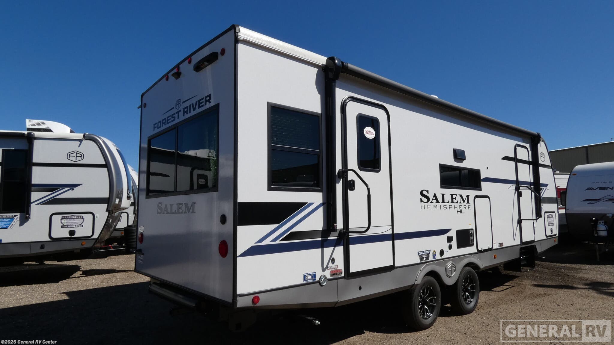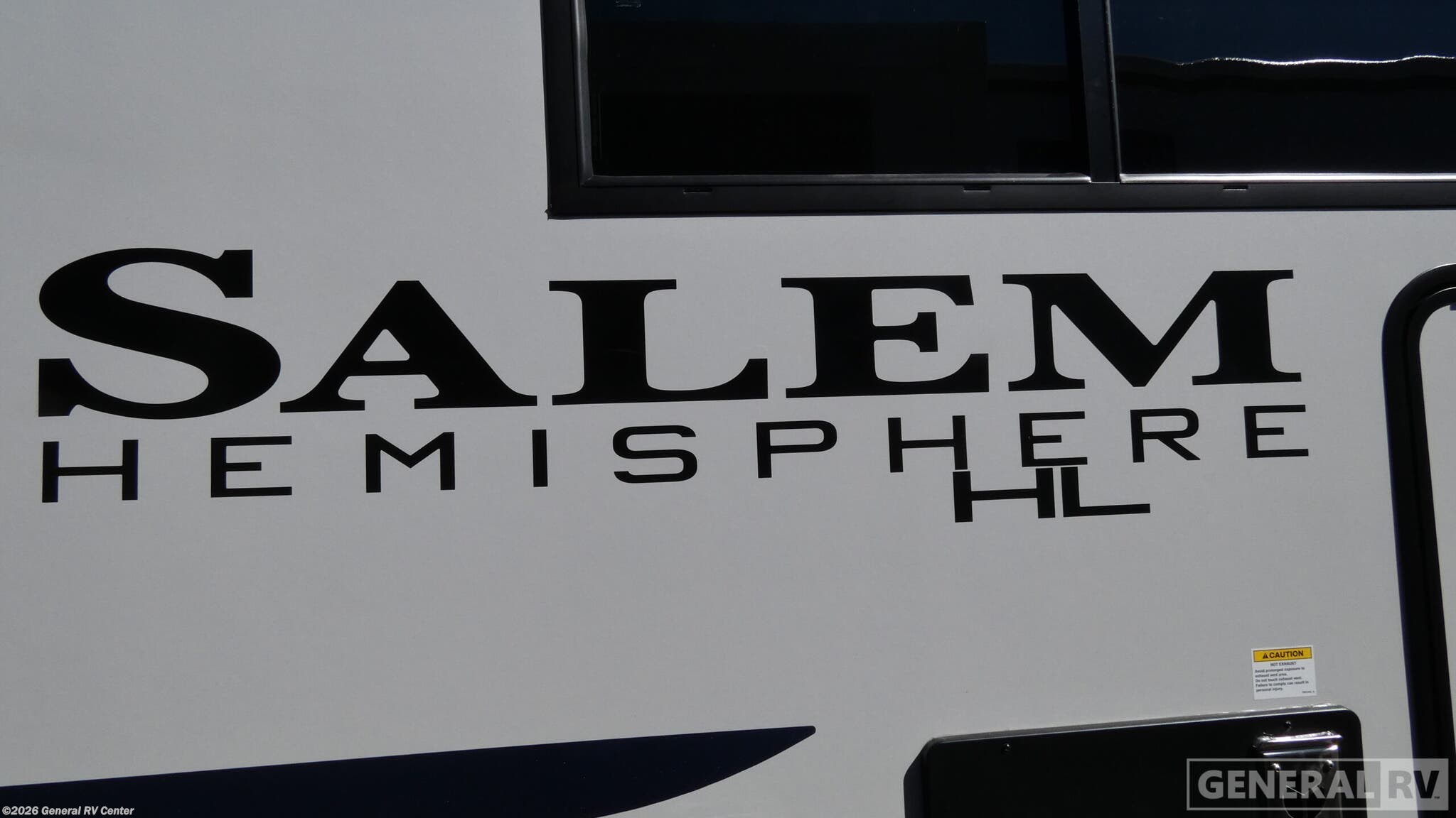 Experience the perfect blend of comfort and style with the 2026 Forest River Salem Hemisphere Hyper-Lyte 24RDHL. This travel trailer offers a spacious and inviting layout, featuring a rear living area with plush theater seating and expansive panoramic windows, perfect for soaking in scenic views. The center kitchen, equipped with a 10 cu ft 12V refrigerator and a three-burner cooktop, is designed for culinary adventures, while the cozy dinette ensures memorable meals with loved ones. Retreat to the front bedroom, where a luxurious queen bed with Versa-Tilt awaits, promising restful nights under the stars. The center bath, complete with a walk-in shower and skylight, adds a touch of spa-like relaxation to your travels. With ample storage, including XL Texas-sized pass-through compartments, and a 19 ft. powered retractable awning for shaded outdoor enjoyment, this RV is crafted for those who seek both adventure and relaxation. Visit your nearest General RV dealership to explore this exceptional model in person.