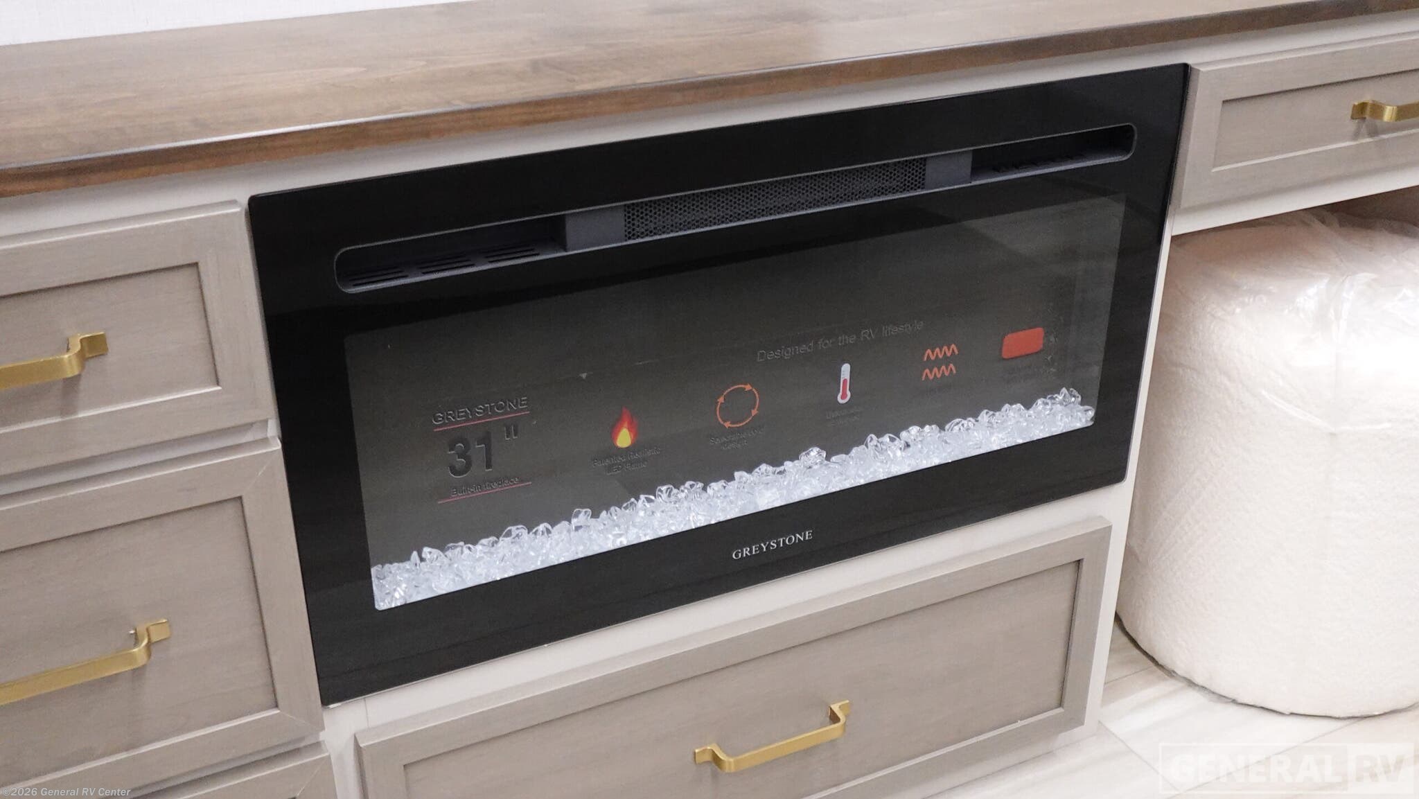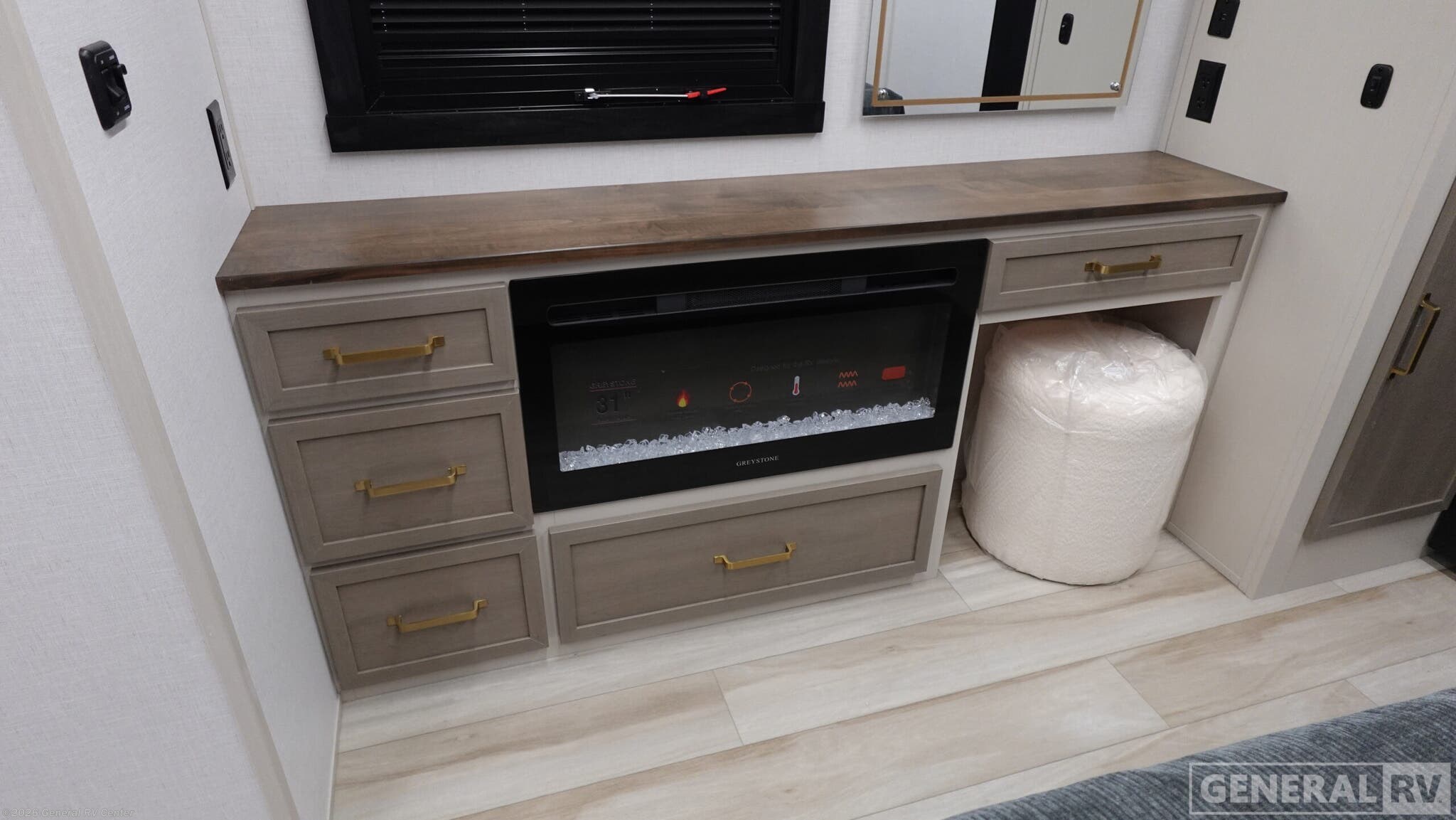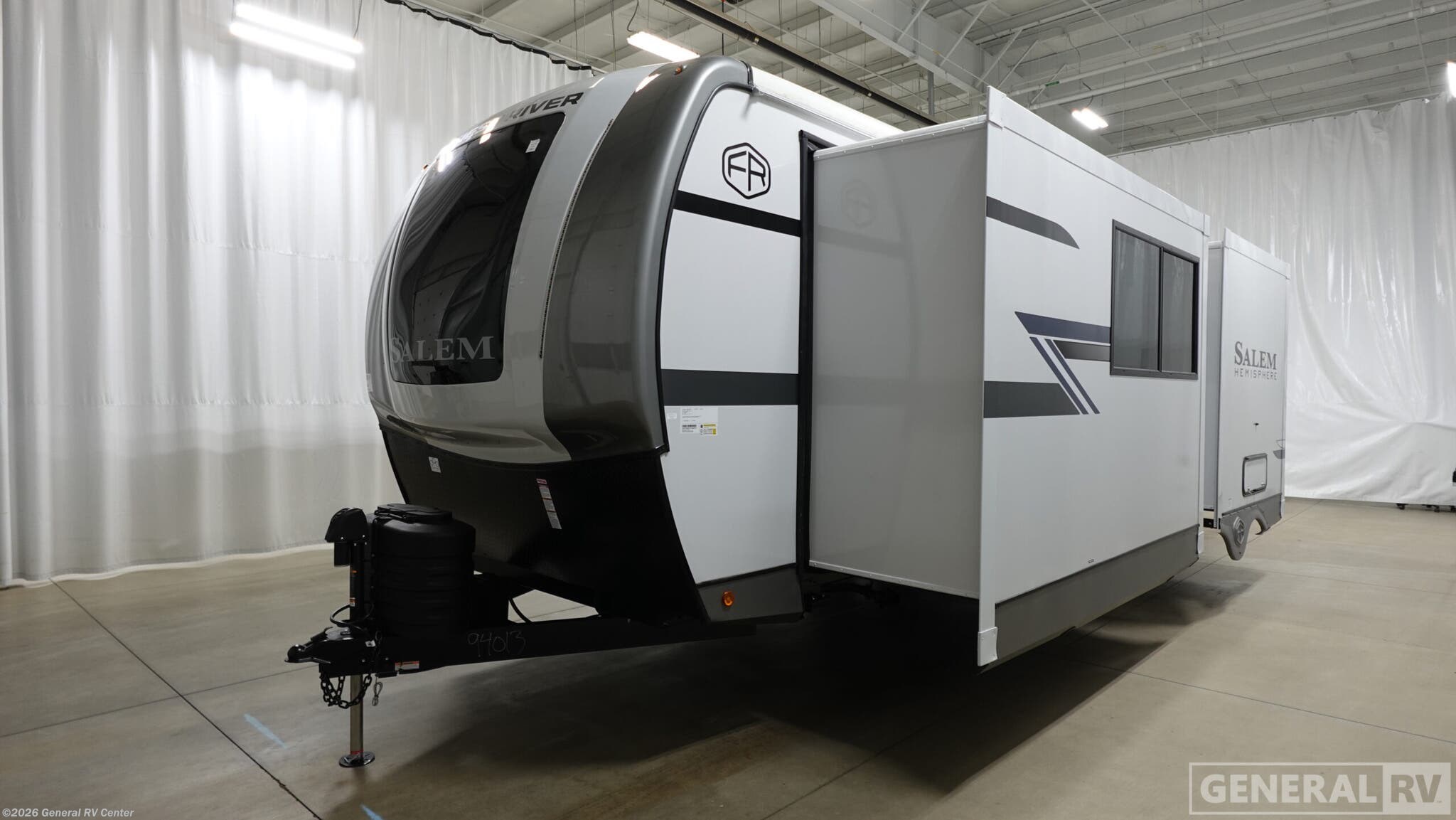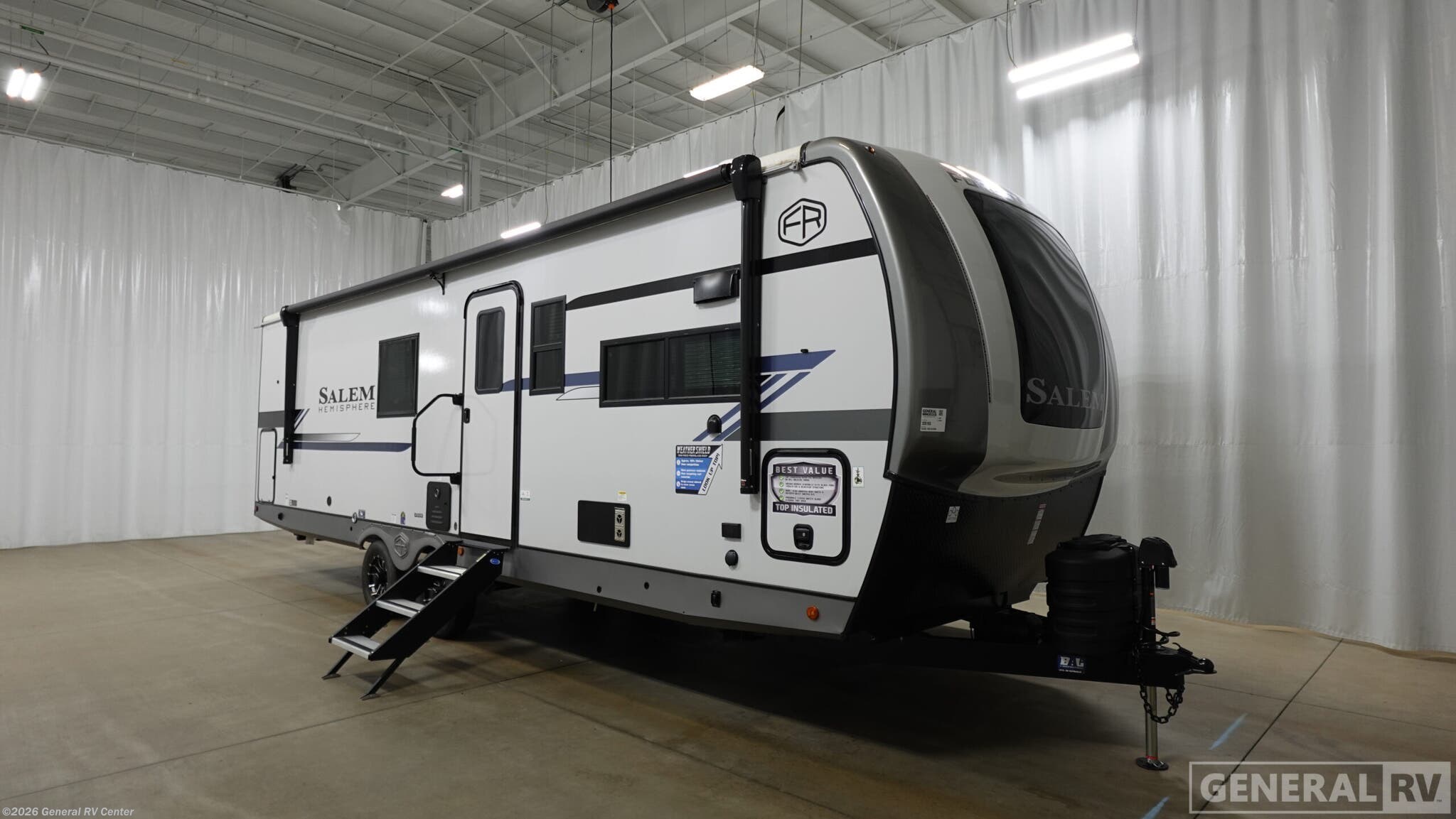 Experience the perfect blend of luxury and practicality with the 2026 Forest River Salem Hemisphere 261FKRB. This meticulously designed RV offers a spacious and inviting front kitchen layout, perfect for culinary enthusiasts. The kitchen features a 10 cu. ft. full-size electric refrigerator and a three-burner cooktop, ensuring you have all the essentials to whip up delicious meals on the road. The center living area is a cozy retreat with a 67" theater seat, ideal for relaxing after a day of adventure. Enjoy the warmth and ambiance of the dresser with a fireplace, creating a homely atmosphere even when you're miles away from home. In the rear, the king-sized bed promises restful nights, complemented by ample storage with overhead cabinets and a wardrobe. The rear bath is equipped with a walk-in shower and dual vanities, offering a spa-like experience. With washer and dryer prep, extended journeys are made even more convenient. Outside, the 22 ft. powered retractable awning provides the perfect spot for outdoor lounging, while the XL Texas-sized storage ensures you have room for all your gear. With a robust build and attention to detail, the Salem Hemisphere 261FKRB is your ticket to unforgettable adventures. For more information, visit your nearest General RV dealership.