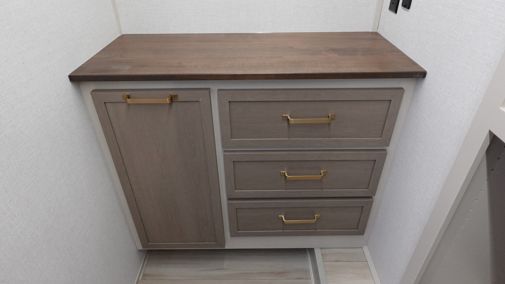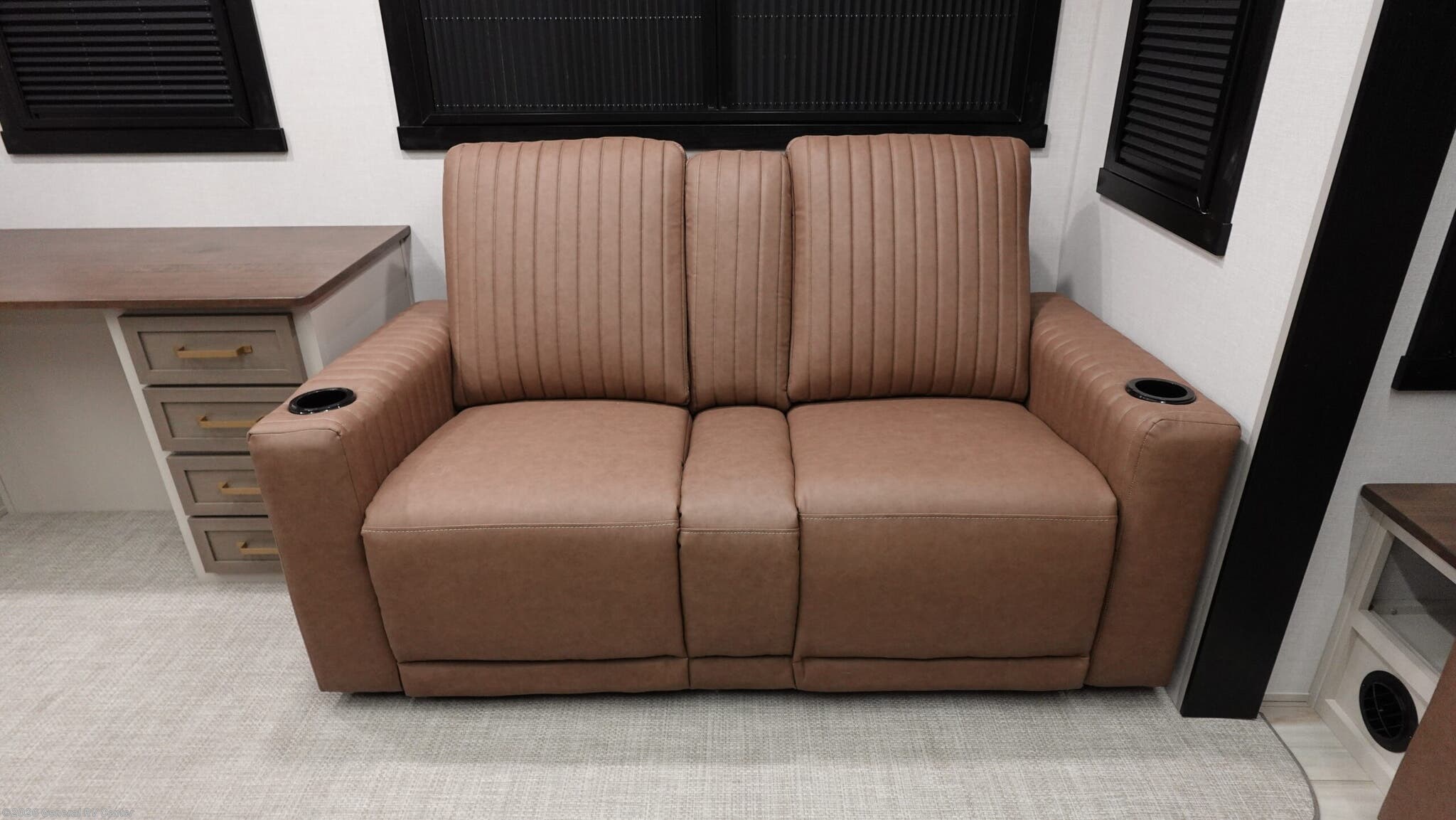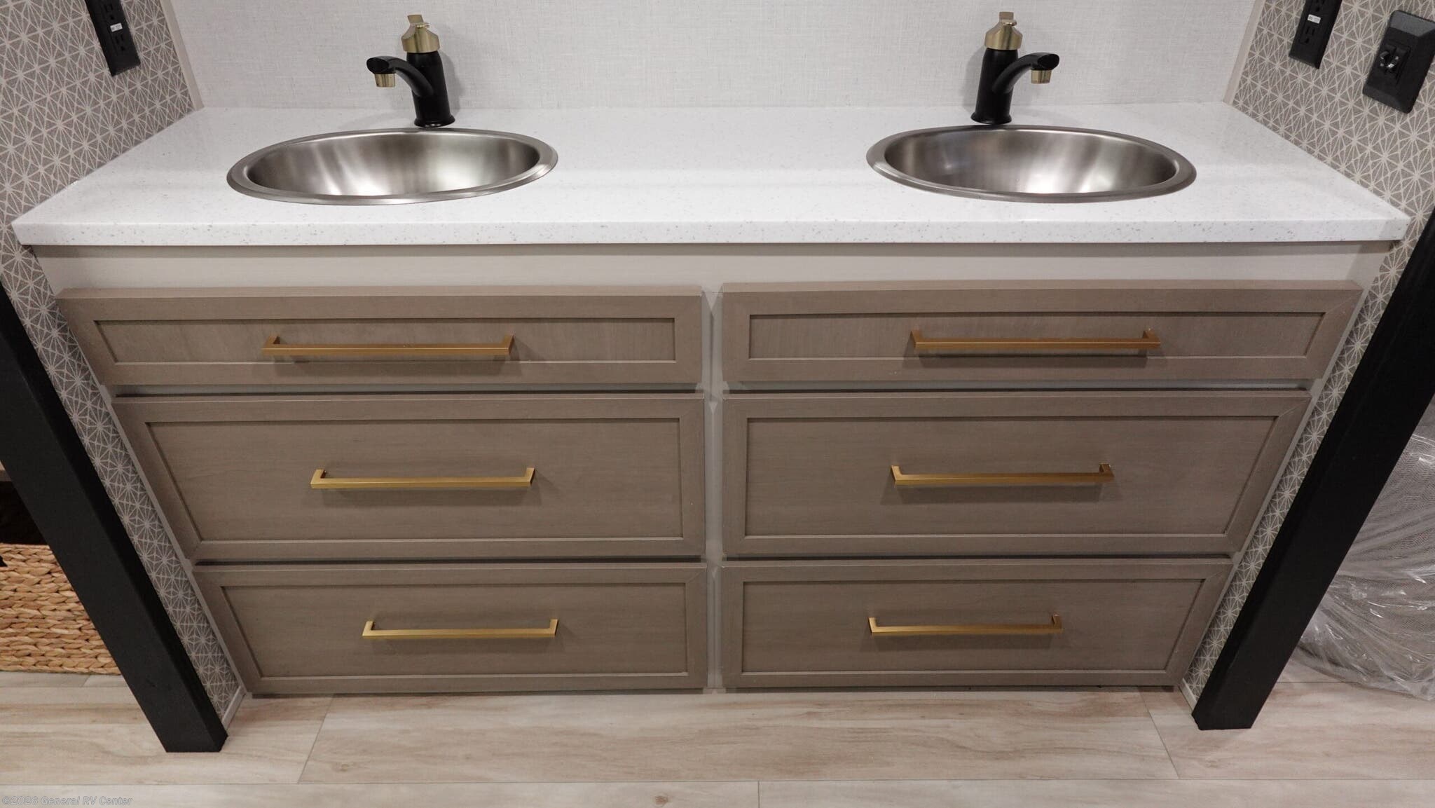 Forest River Salem Hemisphere fifth wheel 380WDR highlights: Bath and a Half Custom King Bed Slide Designated Desk Space Rear Tri-Fold Sofa One look at this fifth wheel and you'll be sold! You can wake up each morning in the master bedroom that includes a custom king bed and a dresser with an ottoman. The front full bath has two bath sinks so you both can get ready at once, and you're going to love the walk-in wardrobe with wrap-around hanging rod. A half bath includes a floating shelf with a hanging rod plus washer/dryer prep, giving you the option to make this a laundry room! The back of this unit is where you can cook meals with full kitchen amenities, dine at the kitchen island with four chairs, and relax on the theater seating and tri-fold sofa. A 50" TV and fireplace is also found here, complete with hidden storage behind for board games, movies, and snacks! The Salem Hemisphere fifth wheels by Forest River are packed with features, while still being value-minded! Each model is constructed with laminated "Aluma Frame" sidewalls and floor with block foam insulation plus full-length barreled ceilings for added head space. There are LED awning, marker and taillights outside, along with an extra-large pass-thru storage with slam latch baggage doors, plus solar prep and Lippert On-The-Go ladder prep. The 60K on-demand tankless water heater will provide endless hot showers, and the JBL sound system includes a head unit plus interior and exterior speakers to keep the party going. There are also many interior comforts found throughout that will make you feel right at home!