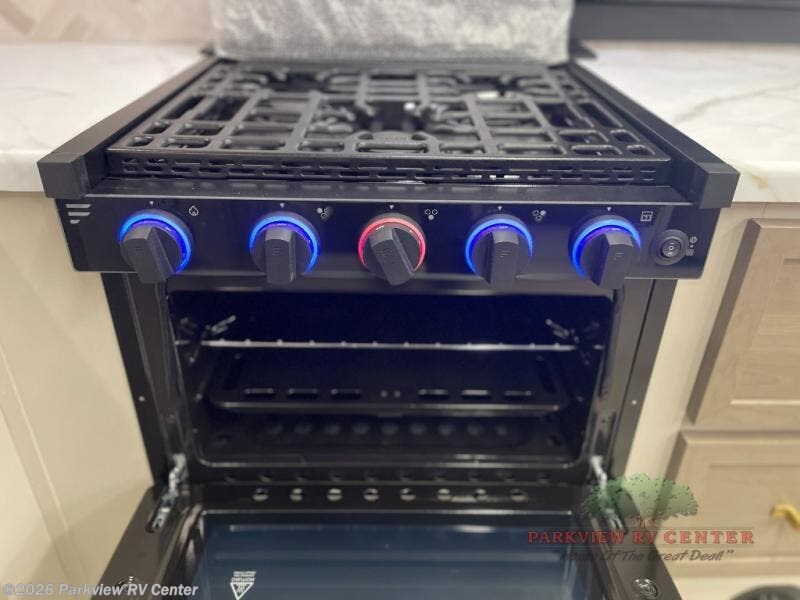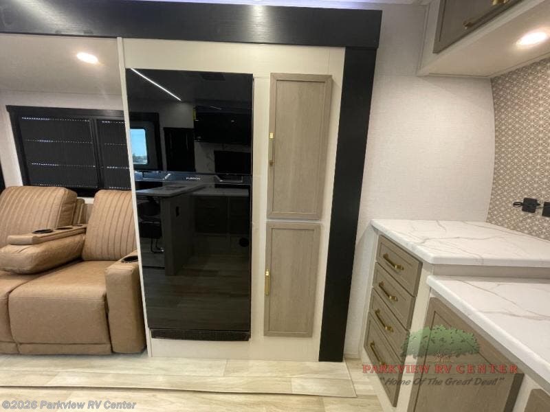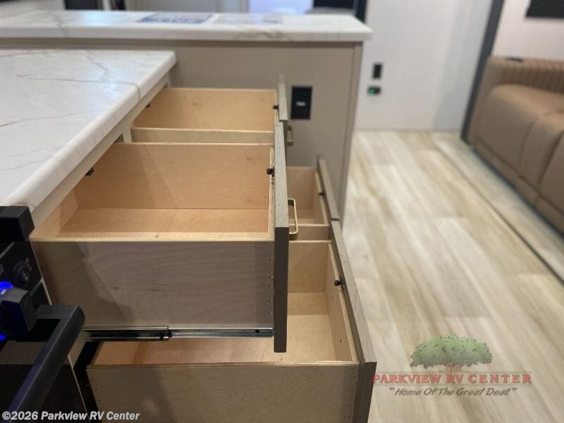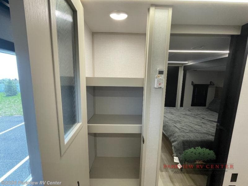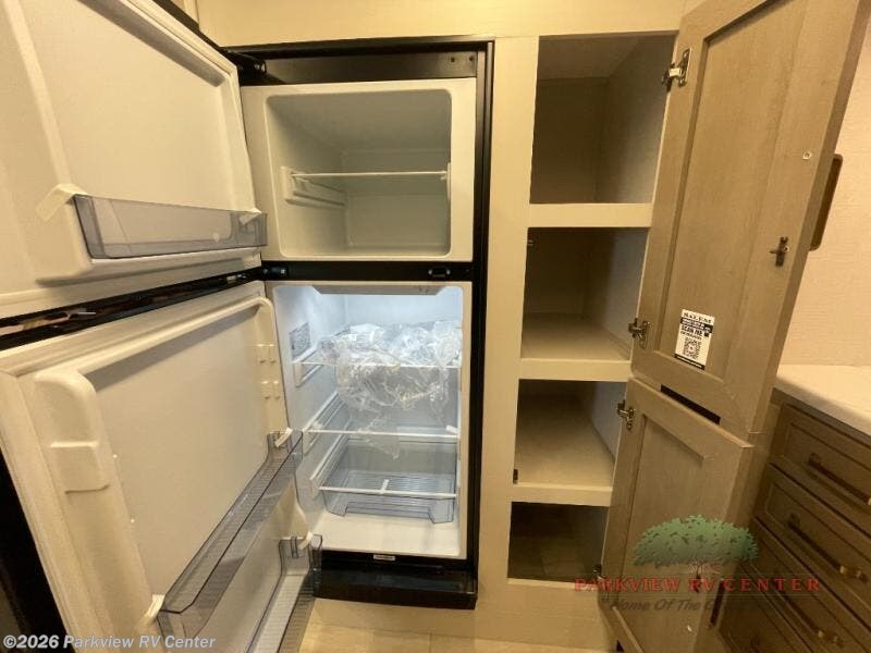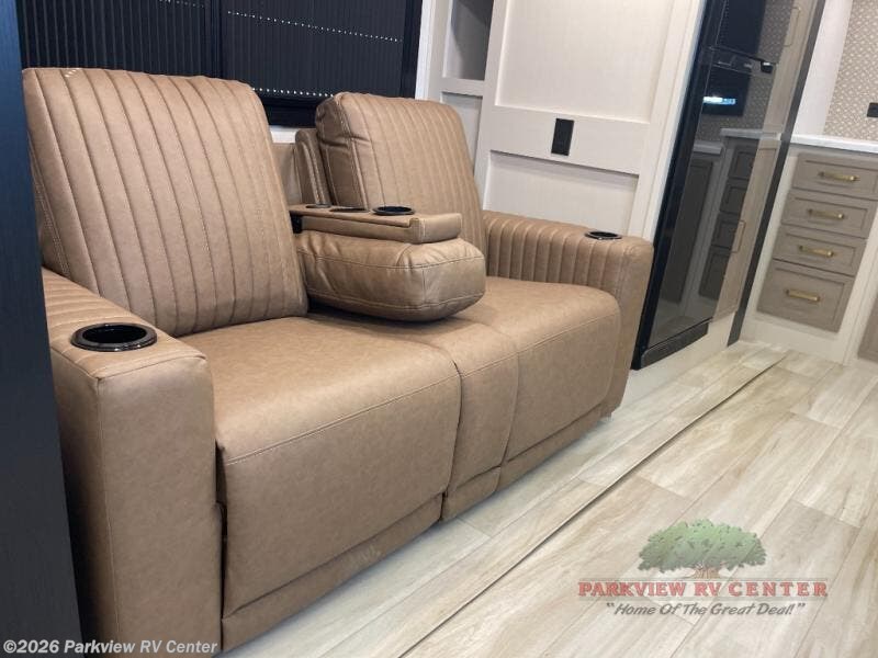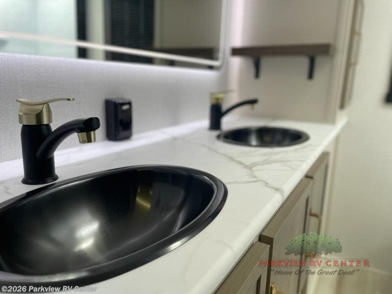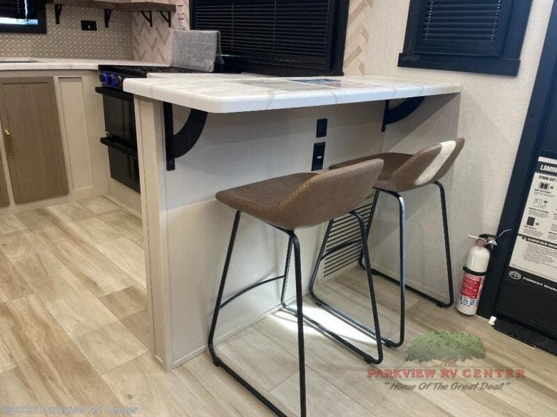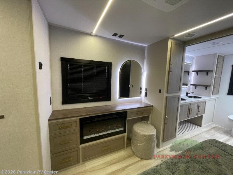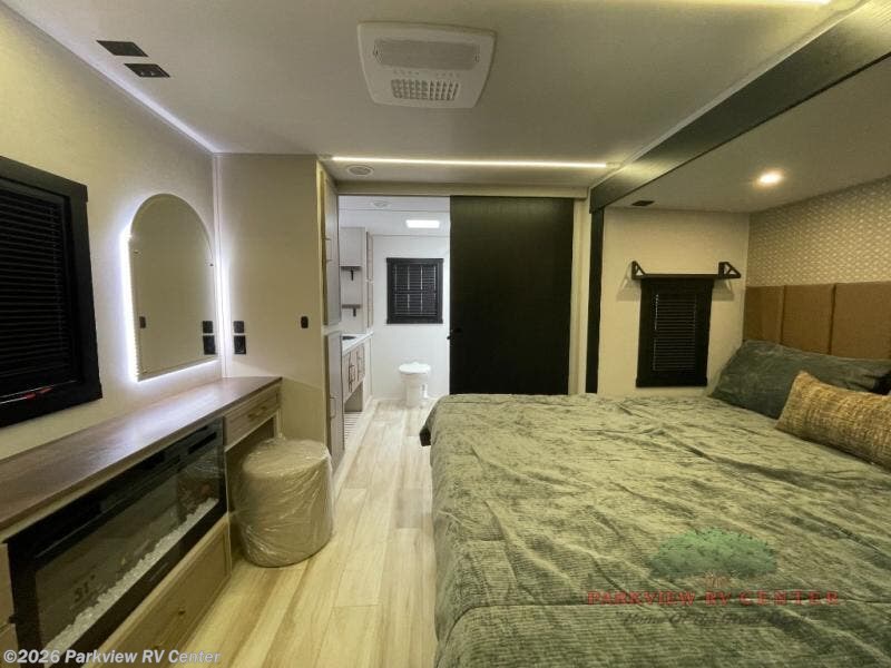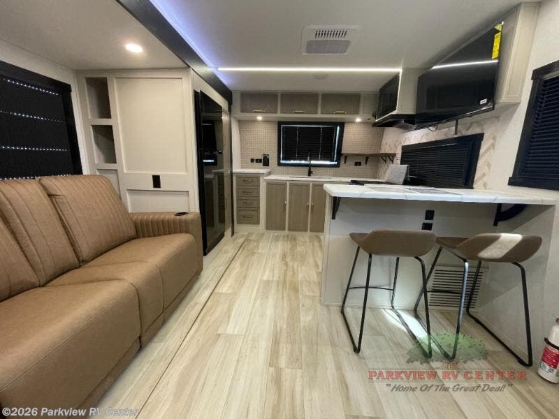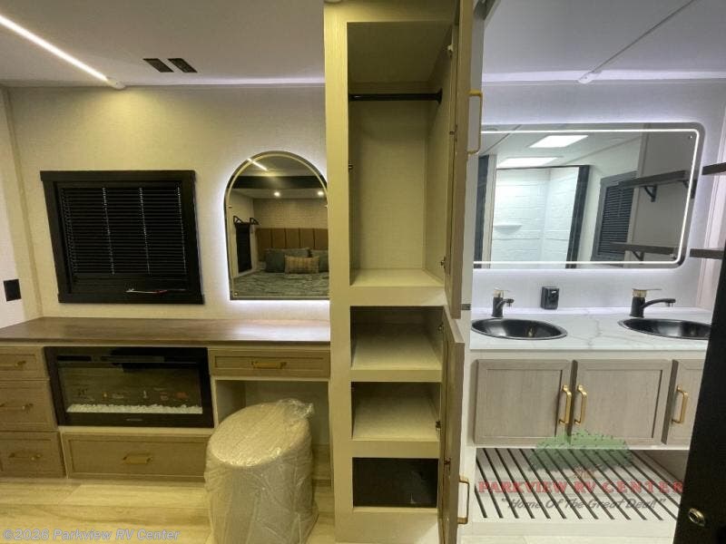 This is the perfect couple's trailer for weekend trips to the campground. The front kitchen includes ample counter space, including a bar top with two stools. You can relax on the theater seat within the slide out here, and the pantry and 12V refrigerator is close by so you can grab a snack. A master bedroom includes a custom king bed slide out, a panoramic window, an ottoman, plus a dresser with a fireplace to make your space cozy. The full rear bath includes dual bath sinks, a walk-in shower with a skylight, plus washer and dryer connections if you want to add those appliances.