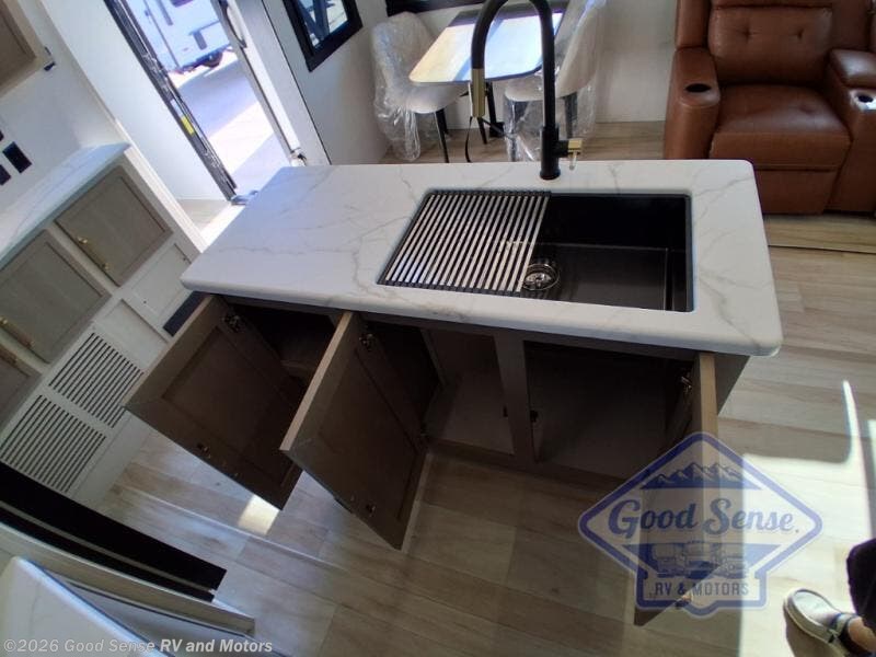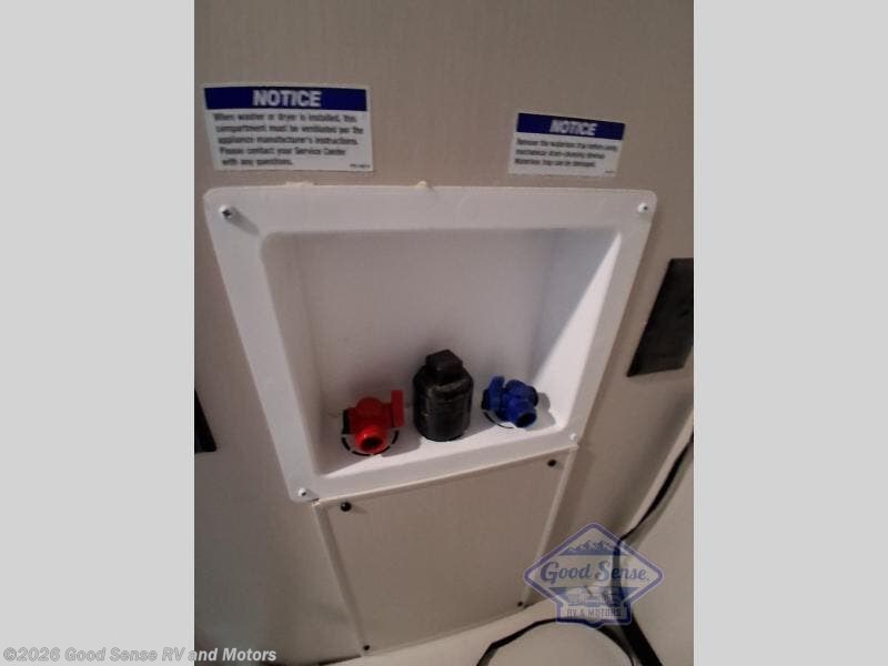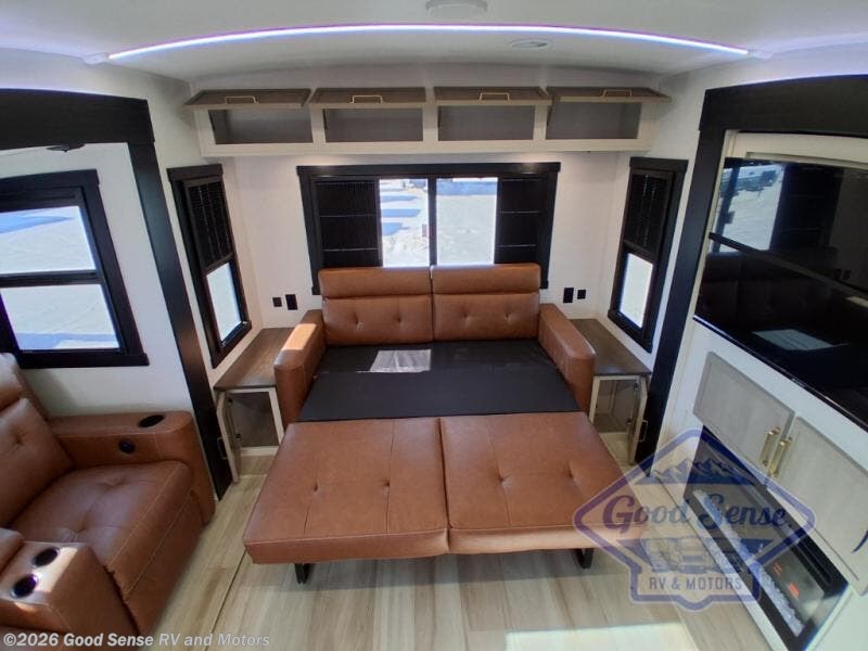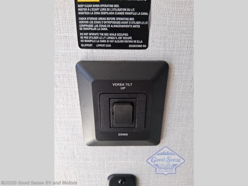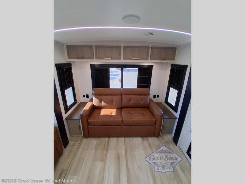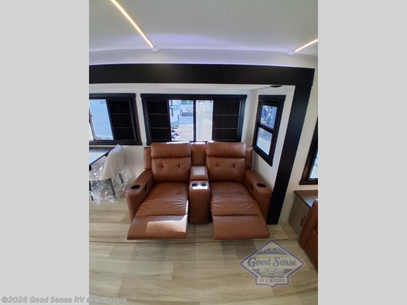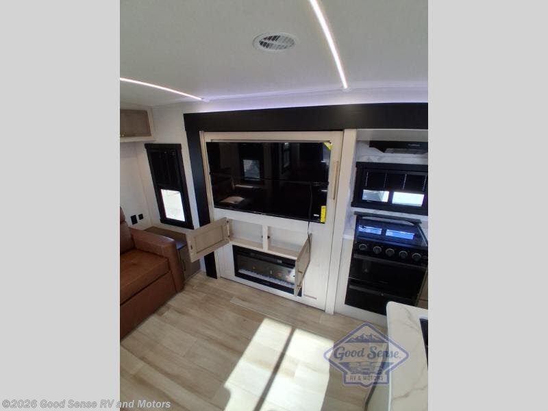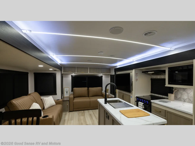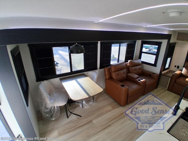Step inside this luxurious travel trailer and see all that it has to offer! You will enjoy a good night's rest each night on the queen bed with Versa Tilt with wardrobes on either side to keep your clothes wrinkle free, and if you have a couple of guests then you can convert the rear tri-fold sofa or the booth dinette into a sleeping space. The 30" x 36" walk-in shower with a skylight above invites you to take a hot, steamy shower after a fun-filled day outdoors. Once you're cleaned up, you can grab some leftovers from the 10 cu. ft. 12V black refrigerator and warm it up in the microwave. There is also theatre seating across from the 50" LED TV with a fireplace below!