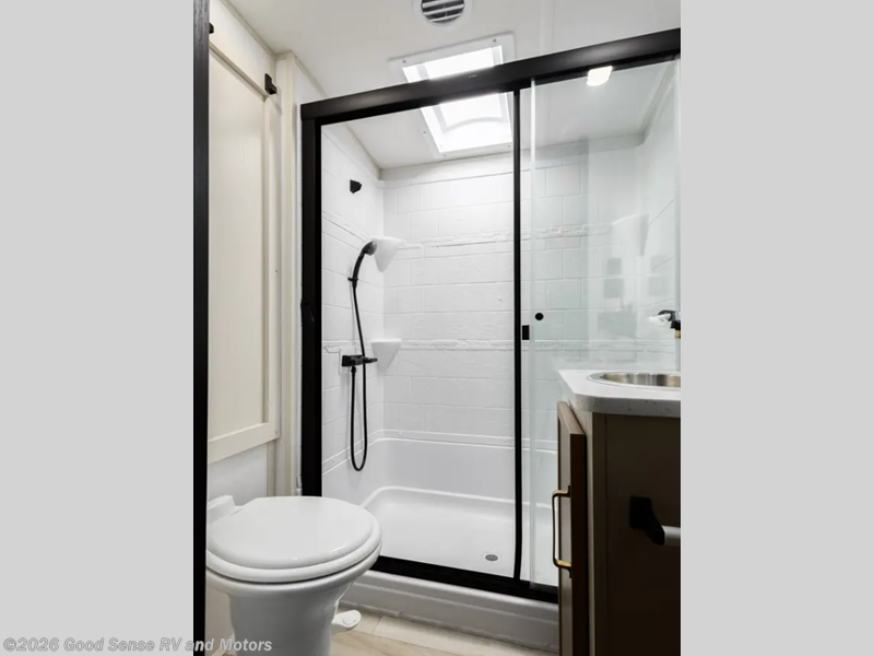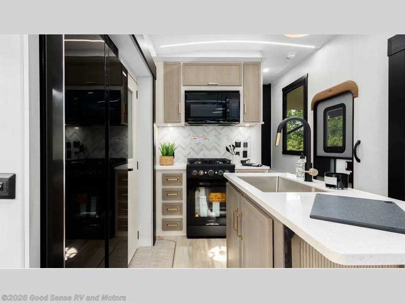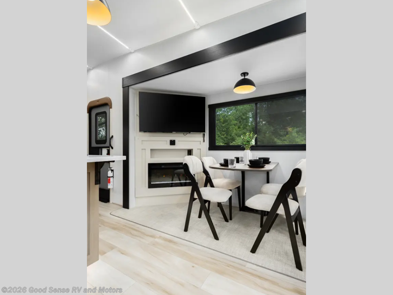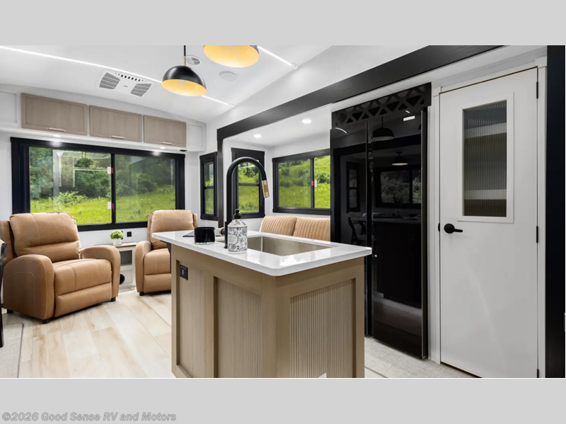 Enjoy the sunshine with panoramic windows throughout this fifth wheel! The rear living area is perfect for relaxing in at night on one of the two chairs or the tri-fold sofa. There is also a table with four chairs, a 50" LED TV, and a fireplace to make this area feel more like home. The kitchen has an island with a large sink to make clean up easier and a pantry big enough to store everyone's favorite snacks. The full bathroom has a residential walk-in shower with a skylight above for natural lighting as you get ready. When you're ready to hit the sack, head to the front private bedroom and enjoy a good night's rest on the custom king bed!