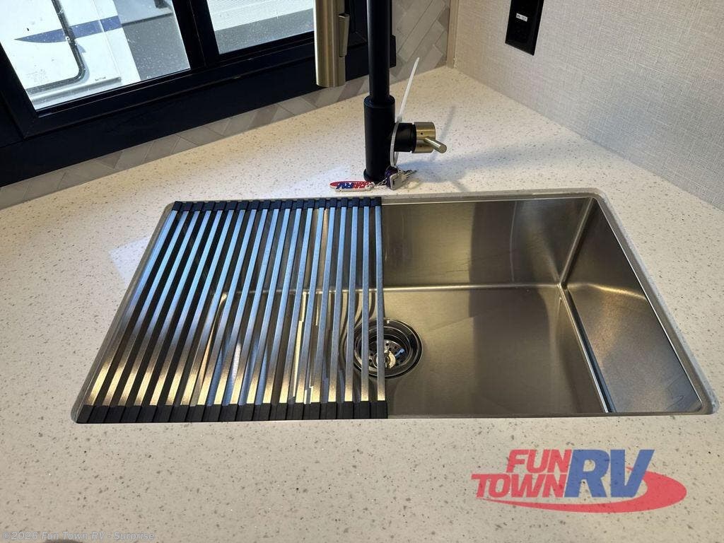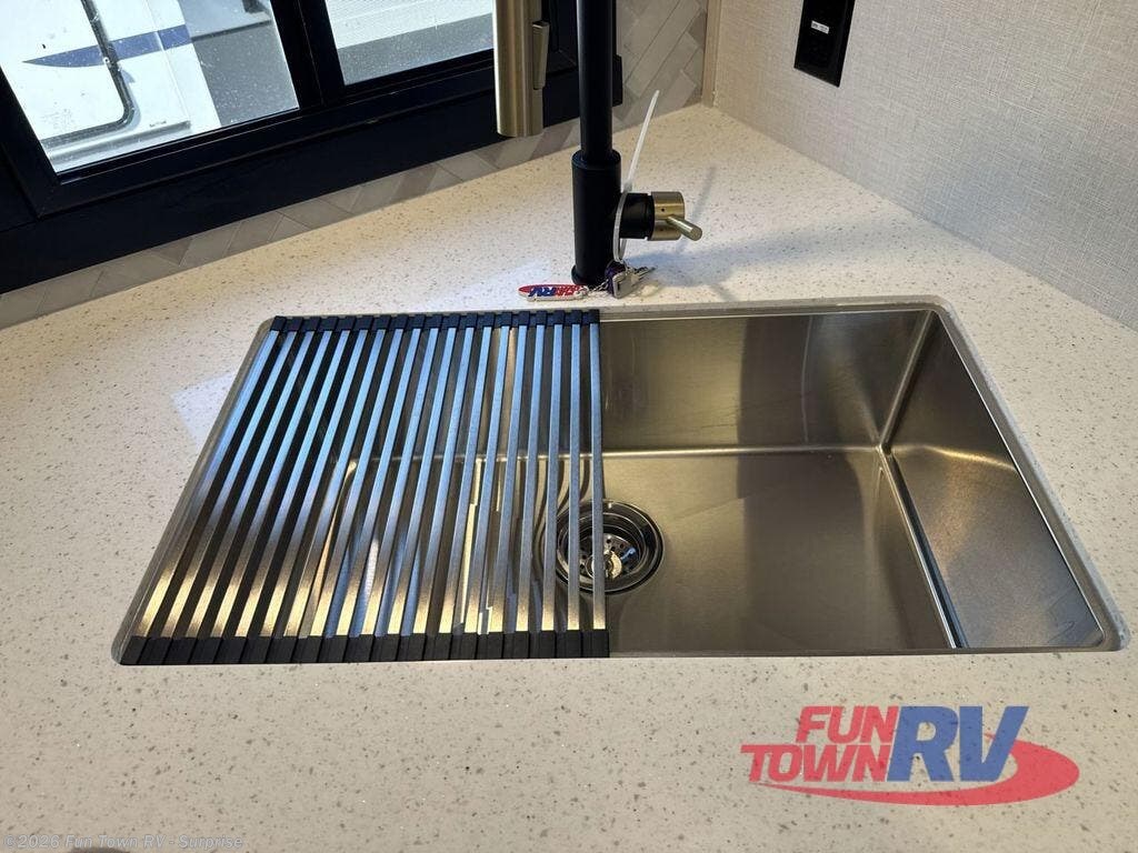 With two full bathrooms, everyone will stay clean in this fifth wheel! The double entry doors makes for a smooth flow of traffic and the unique rear entrance leads directly into the rear full bathroom. The private bunkhouse features not only one bunk above a Versa queen convertible bed/sofa, but also a second bunk above with storage. The U-shaped dinette is the perfect place for you to enjoy your meals at, play some card games and even transform into an extra sleeping space. The exterior has plenty of features you will love too like the outside kitchen/bar so you can have a good time cooking outdoors and a coax/TV hookup that you can add your own outside TV, plus an extra large pass-through storage area for your outdoor gear. When you're ready for bed, the custom king bed will be waiting for you in the front private bedroom!