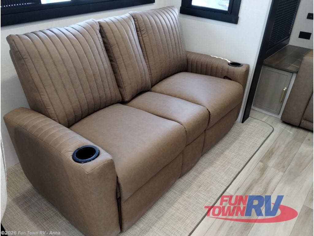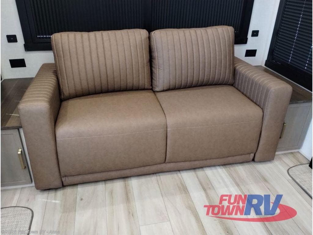You won't know where to begin when you enter this fifth wheel! The rear living area has plenty of entertainment and seating choices between the tri-fold sofa and the theatre seating with cupholders, and the 50" LED TV will be perfect for movie nights. Meal prepping and clean up will be a breeze thanks to the kitchen island with a large sink, and the deluxe French door pantry that is big enough to store everyone's favorite snacks. Inside the middle bunkhouse, you will find a bunk with a Versa queen convertible bed/sofa below it and a loft above this room, plus there is a desk with a TV hookup and a dresser with a wardrobe. The outside also has lots of features you will love like the exterior storage with a refrigerator, the coax/TV hookup, two awnings and the Texas-sized pass-through storage area!