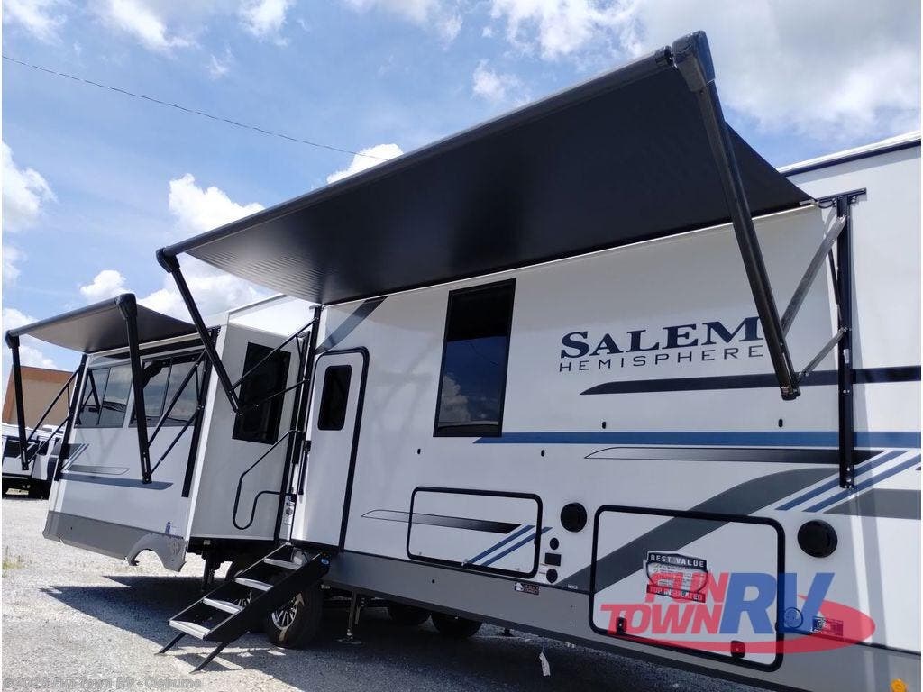 The Salem Hemisphere fifth wheels and travel trailers by Forest River are packed with features, while still being value-minded! Each model is constructed with laminated "Aluma Frame" sidewalls and floor with block foam insulation plus full length barreled ceilings for added head space. There are LED awning, marker and tail lights outside, along with an extra large pass-thru storage with slam latch baggage doors, plus solar prep and Lippert On-The-Go ladder prep. The 60K on-demand tankless water heater will provide endless hot showers, and the JBL sound system includes a head unit plus interior and exterior speakers to keep the party going. There are also many interior comforts found throughout that will make you feel right at home!