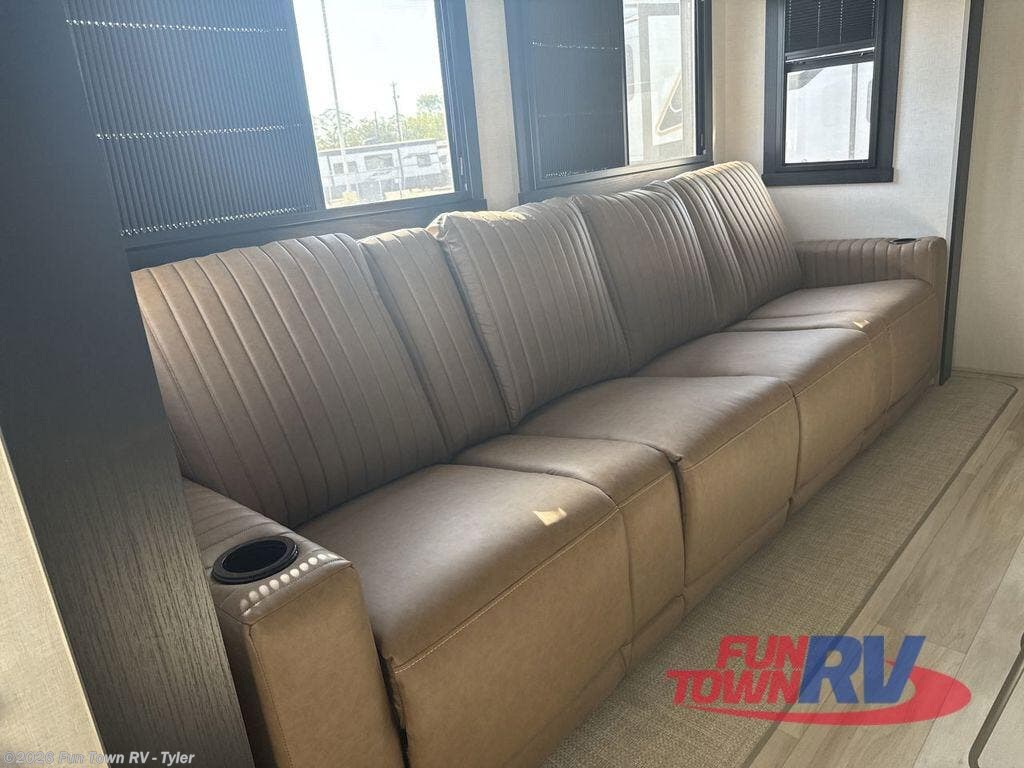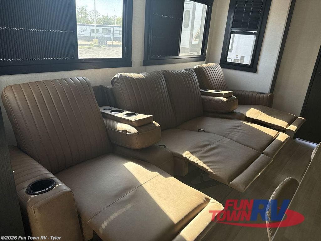 The whole family will love camping in this spacious fifth wheel! There are four slide outs, two bedrooms, plus two full baths, one of which is located in the rear master bedroom. A custom queen bed and dual wardrobes are also found in the master, while a custom king bed is found in the front private bedroom. And the loft with bunk mats can be used for additional sleeping or storage space! The chef of your group will find a full kitchen to cook meals, including ample counter space and a 16-cu. ft. 12V refrigerator and hidden storage behind the 50" TV for snacks or movies. The theater seating with cup holders provides a comfy place to relax each day, and the kitchen island with chairs will be perfect for dining space!