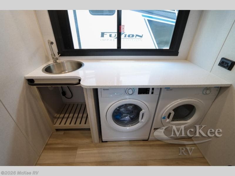 One look at this fifth wheel and you'll be sold! You can wake up each morning in the master bedroom that includes a custom king bed and a dresser with an ottoman. The front full bath has two bath sinks so you both can get ready at once, and you're going to love the walk-in wardrobe with wrap-around hanging rod. A half bath includes a floating shelf with a hanging rod plus washer/dryer prep, giving you the option to make this a laundry room! The back of this unit is where you can cook meals with full kitchen amenities, dine at the kitchen island with four chairs, and relax on the theater seating and tri-fold sofa. A 50" TV and fireplace is also found here, complete with hidden storage behind for board games, movies, and snacks!