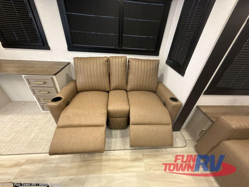 One look at this fifth wheel and you'll be sold! You can wake up each morning in the master bedroom that includes a custom king bed and a dresser with an ottoman. The front full bath has two bath sinks so you both can get ready at once, and you're going to love the walk-in wardrobe with wrap-around hanging rod. A half bath includes a floating shelf with a hanging rod plus washer/dryer prep, giving you the option to make this a laundry room! The back of this unit is where you can cook meals with full kitchen amenities, dine at the kitchen island with four chairs, and relax on the theater seating and tri-fold sofa. A 50" TV and fireplace is also found here, complete with hidden storage behind for board games, movies, and snacks!