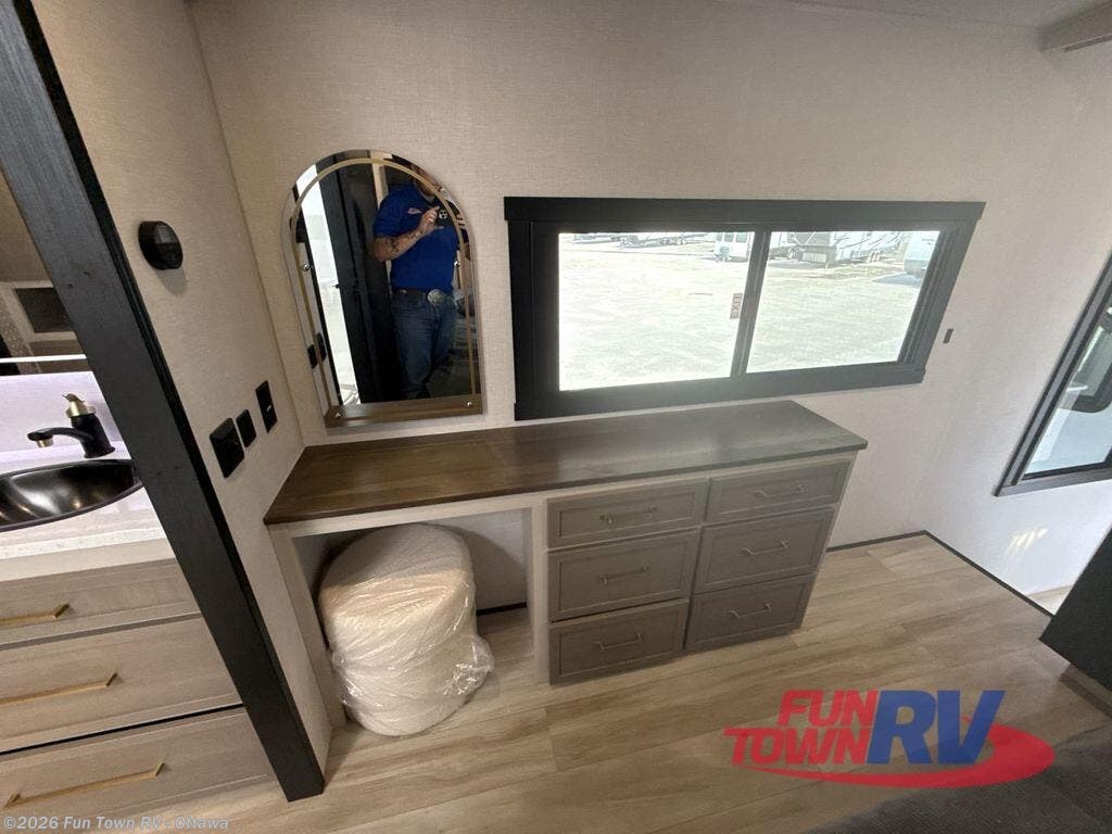 One look at this fifth wheel and you'll be sold! You can wake up each morning in the master bedroom that includes a custom king bed and a dresser with an ottoman. The front full bath has two bath sinks so you both can get ready at once, and you're going to love the walk-in wardrobe with wrap-around hanging rod. A half bath includes a floating shelf with a hanging rod plus washer/dryer prep, giving you the option to make this a laundry room! The back of this unit is where you can cook meals with full kitchen amenities, dine at the kitchen island with four chairs, and relax on the theater seating and tri-fold sofa. A 50" TV and fireplace is also found here, complete with hidden storage behind for board games, movies, and snacks!