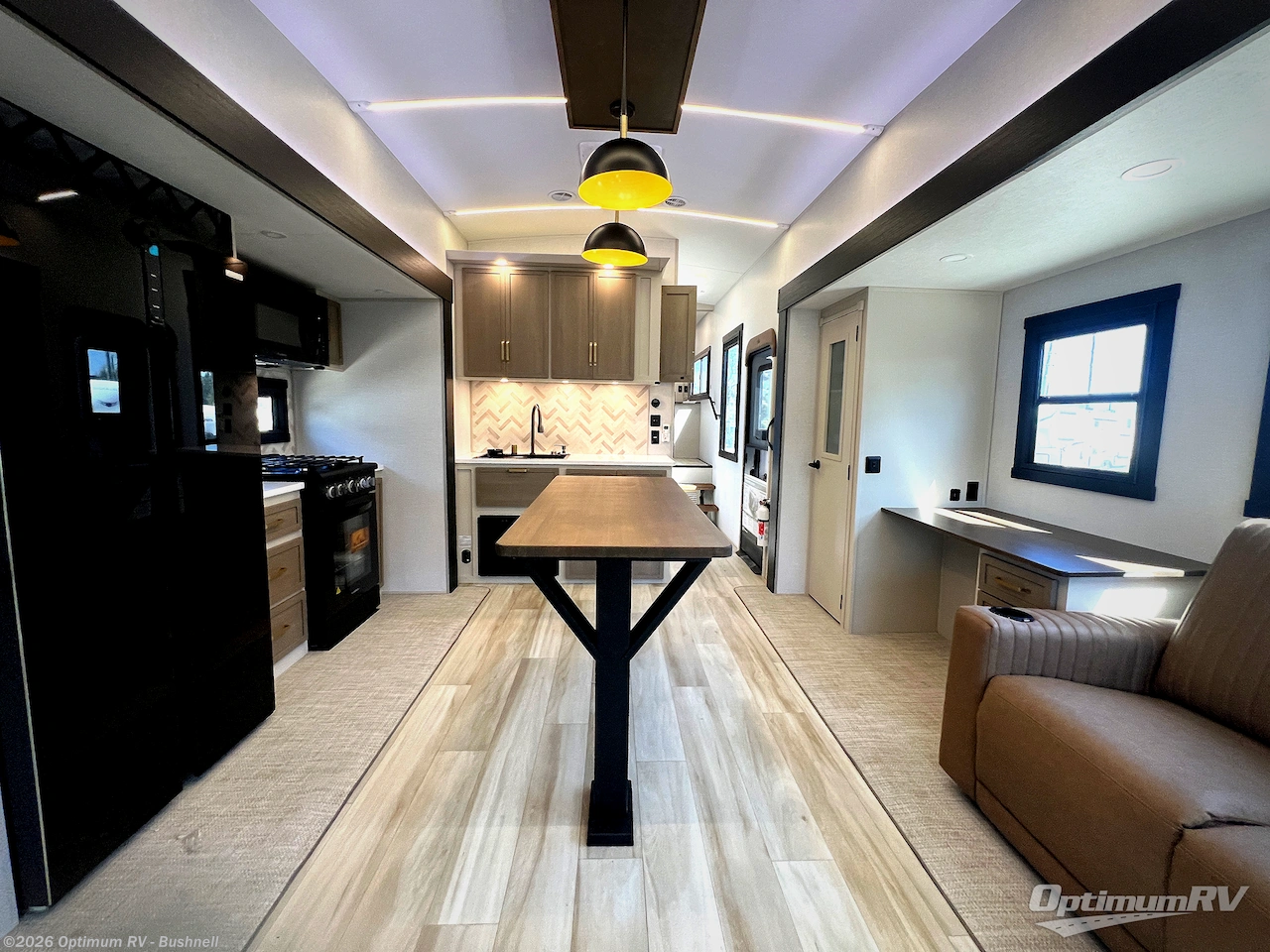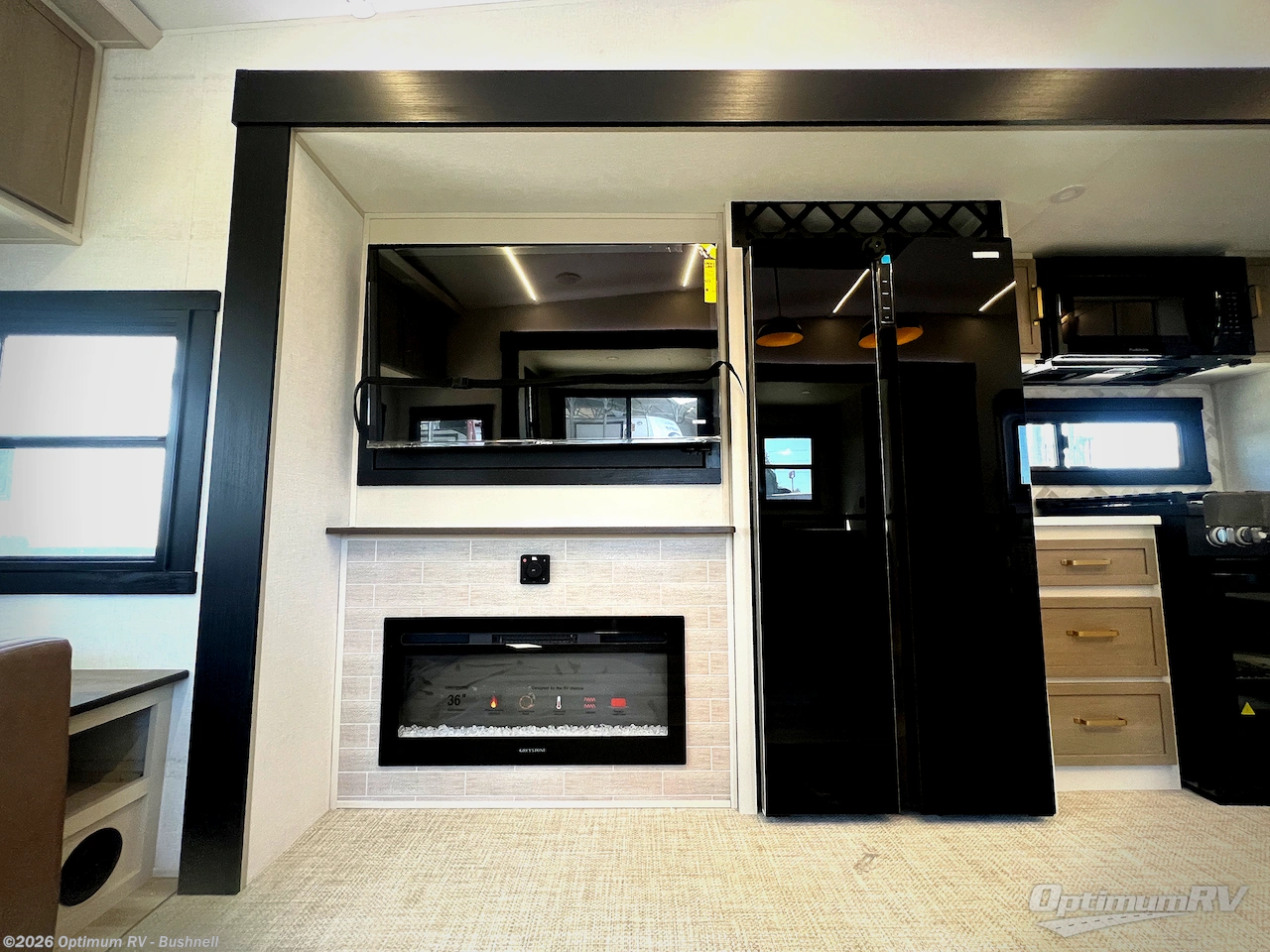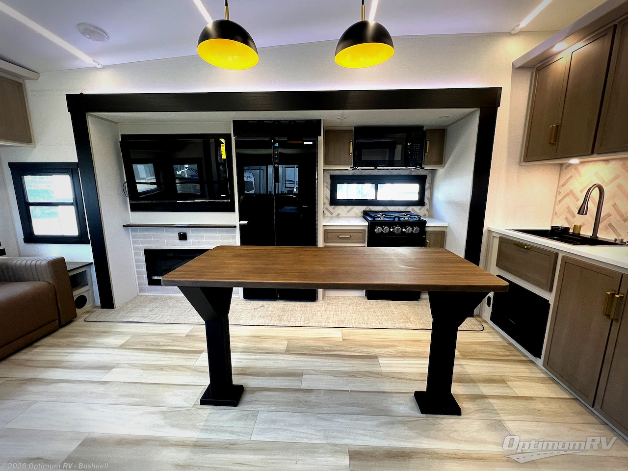 One look at this fifth wheel and you'll be sold! You can wake up each morning in the master bedroom that includes a custom king bed and a dresser with an ottoman. The front full bath has two bath sinks so you both can get ready at once, and you're going to love the walk-in wardrobe with wrap-around hanging rod. A half bath includes a floating shelf with a hanging rod plus washer/dryer prep, giving you the option to make this a laundry room! The back of this unit is where you can cook meals with full kitchen amenities, dine at the kitchen island with four chairs, and relax on the theater seating and tri-fold sofa. A 50" TV and fireplace is also found here, complete with hidden storage behind for board games, movies, and snacks!