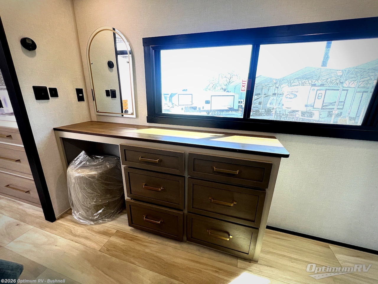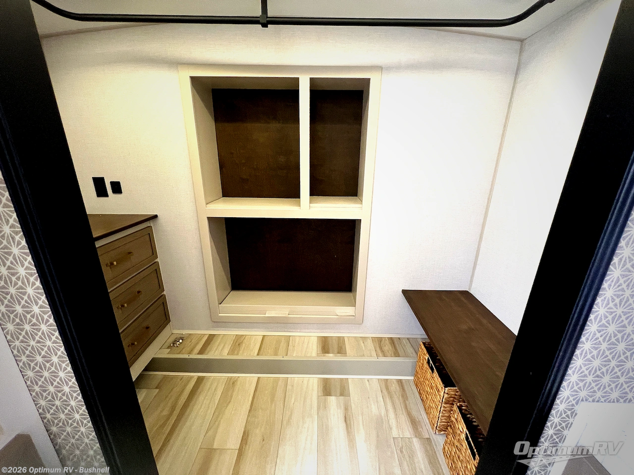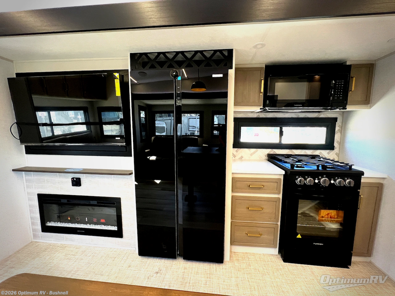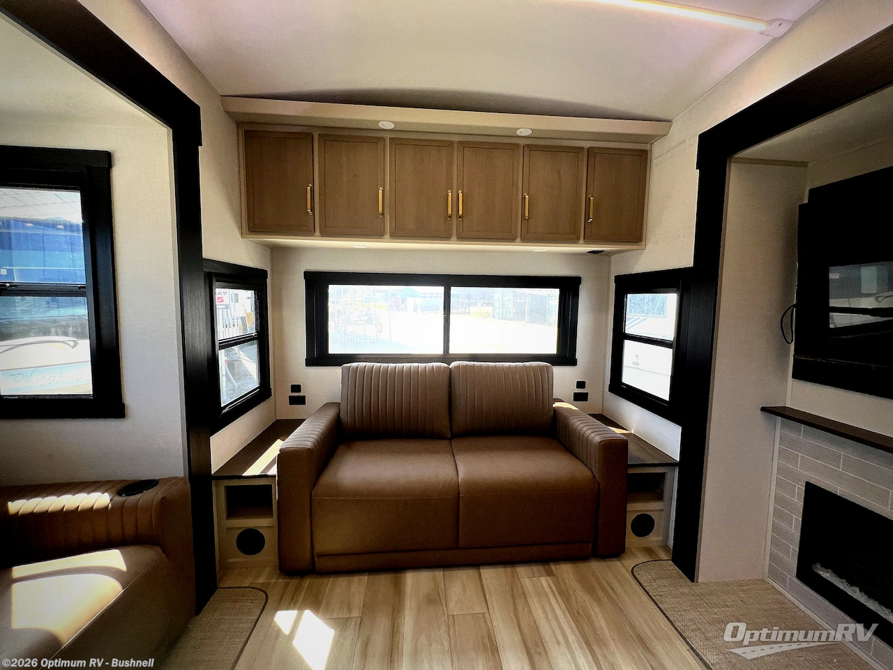 One look at this fifth wheel and you'll be sold! You can wake up each morning in the master bedroom that includes a custom king bed and a dresser with an ottoman. The front full bath has two bath sinks so you both can get ready at once, and you're going to love the walk-in wardrobe with wrap-around hanging rod. A half bath includes a floating shelf with a hanging rod plus washer/dryer prep, giving you the option to make this a laundry room! The back of this unit is where you can cook meals with full kitchen amenities, dine at the kitchen island with four chairs, and relax on the theater seating and tri-fold sofa. A 50" TV and fireplace is also found here, complete with hidden storage behind for board games, movies, and snacks!