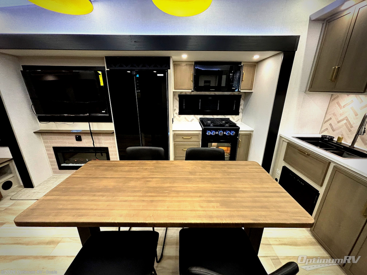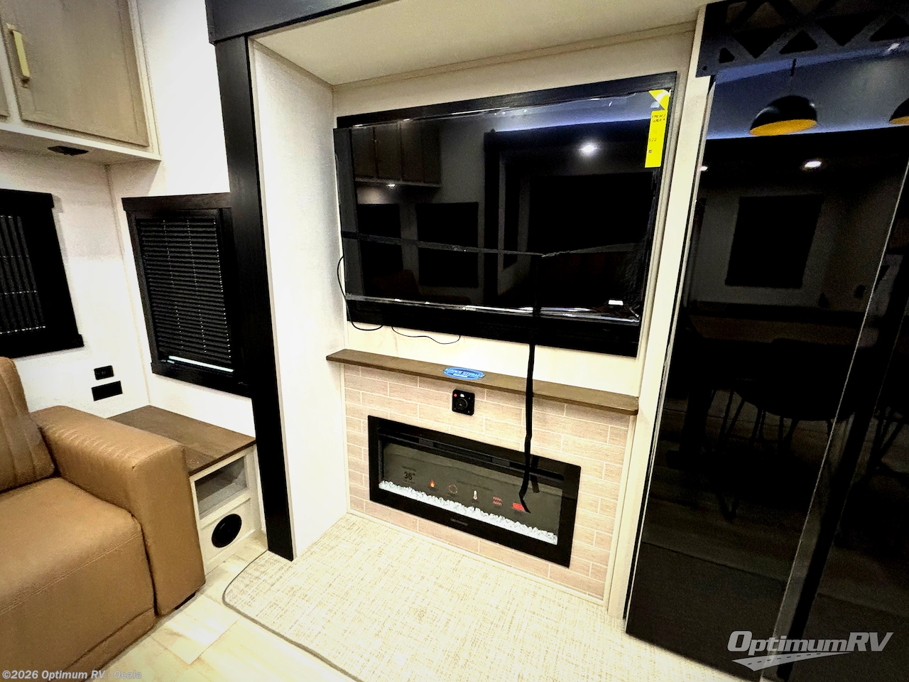 One look at this fifth wheel and you'll be sold! You can wake up each morning in the master bedroom that includes a custom king bed and a dresser with an ottoman. The front full bath has two bath sinks so you both can get ready at once, and you're going to love the walk-in wardrobe with wrap-around hanging rod. A half bath includes a floating shelf with a hanging rod plus washer/dryer prep, giving you the option to make this a laundry room! The back of this unit is where you can cook meals with full kitchen amenities, dine at the kitchen island with four chairs, and relax on the theater seating and tri-fold sofa. A 50" TV and fireplace is also found here, complete with hidden storage behind for board games, movies, and snacks!