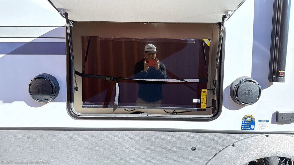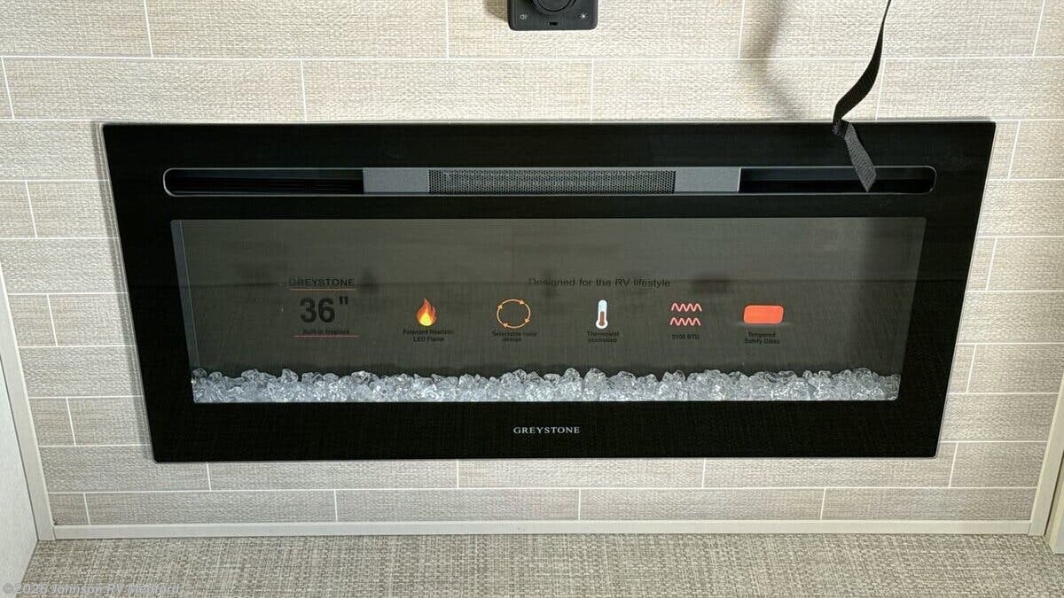 Features Include: Elevated Value, Entry Assist Handle, Designer Flooring, Cathedral Ceiling, Entertainment Center, Chairs (vbm), Overhead Cabinets, Booth Dinette (vbm), Pantry, Roll-Up Sink Cover, 4-Burner Gas Range, Backsplash, Gas Oven, Range Hood, Microwave Oven, Systems Center, Backup Camera Prep, 50-inch LED Smart TV, JBL Sound System, King Bed 66x80, Nightstands, Dresser Drawers, TV Prep, Loft (vbm) Bathroom, Medicine Cabinet, LED Backlit Mirror, Linen Storage, Walk-in Shower, Skylight, Glass Shower Door, Porcelain Toilet, Mini-Max Power Fan, Mechanicals, 50-Amp Service Cord, 15k 2nd AC, Forced Air Furnace, Power Landing Gear, Dexter Axles, Wide Stance Axles, Aluminum Wheels