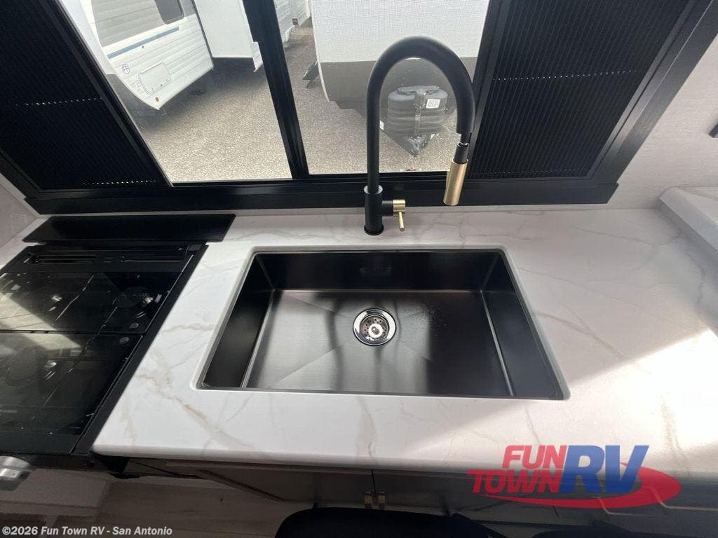 At the front of this well-designed trailer, a private bedroom offers a cozy 60" x 80" queen bed for a restful night’s sleep, complemented by overhead cabinets and a wardrobe for neatly storing clothing and essentials. Moving into the center, a spacious slide-out opens up the living area and houses a comfortable theater seat perfect for lounging after a day of adventure along with a 10 cu. ft. refrigerator and pantry to keep all your groceries and dry goods organized. Across from this space, the L-shaped kitchen provides everything you need to cook your favorite meals, featuring a three-burner range, a residential-style single-bowl undermount sink, and elegant Nordic marble countertops. At the end of the kitchen, a convenient bar top with stools creates a welcoming spot to enjoy meals or unwind with a drink. Toward the rear, the full bathroom adds a touch of luxury with a porcelain toilet, dual sinks, and an LED backlit mirror, allowing two people to get ready comfortably and without the morning rush.