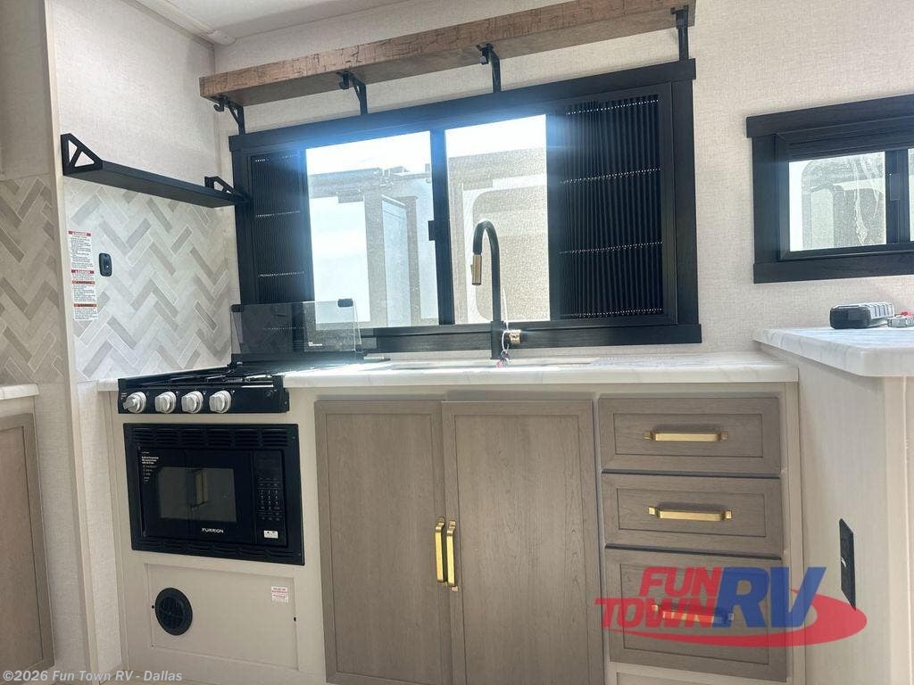 At the front of this well-designed trailer, a private bedroom offers a cozy 60" x 80" queen bed for a restful night’s sleep, complemented by overhead cabinets and a wardrobe for neatly storing clothing and essentials. Moving into the center, a spacious slide-out opens up the living area and houses a comfortable theater seat perfect for lounging after a day of adventure along with a 10 cu. ft. refrigerator and pantry to keep all your groceries and dry goods organized. Across from this space, the L-shaped kitchen provides everything you need to cook your favorite meals, featuring a three-burner range, a residential-style single-bowl undermount sink, and elegant Nordic marble countertops. At the end of the kitchen, a convenient bar top with stools creates a welcoming spot to enjoy meals or unwind with a drink. Toward the rear, the full bathroom adds a touch of luxury with a porcelain toilet, dual sinks, and an LED backlit mirror, allowing two people to get ready comfortably and without the morning rush.