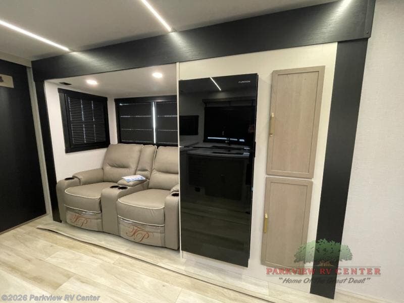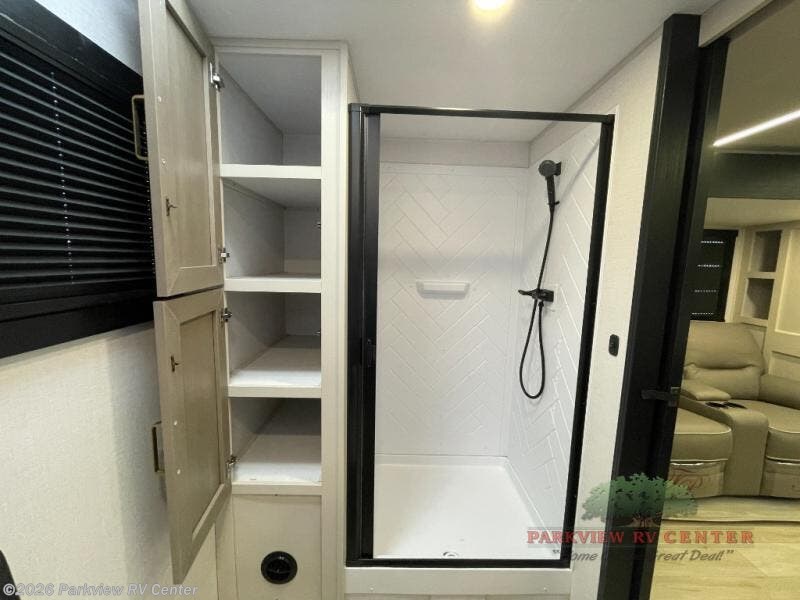At the front of this well-designed trailer, a private bedroom offers a cozy 60" x 80" queen bed for a restful night’s sleep, complemented by overhead cabinets and a wardrobe for neatly storing clothing and essentials. Moving into the center, a spacious slide-out opens up the living area and houses a comfortable theater seat perfect for lounging after a day of adventure along with a 10 cu. ft. refrigerator and pantry to keep all your groceries and dry goods organized. Across from this space, the L-shaped kitchen provides everything you need to cook your favorite meals, featuring a three-burner range, a residential-style single-bowl undermount sink, and elegant Nordic marble countertops. At the end of the kitchen, a convenient bar top with stools creates a welcoming spot to enjoy meals or unwind with a drink. Toward the rear, the full bathroom adds a touch of luxury with a porcelain toilet, dual sinks, and an LED backlit mirror, allowing two people to get ready comfortably and without the morning rush.