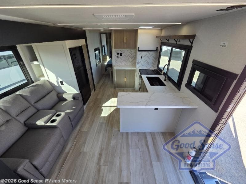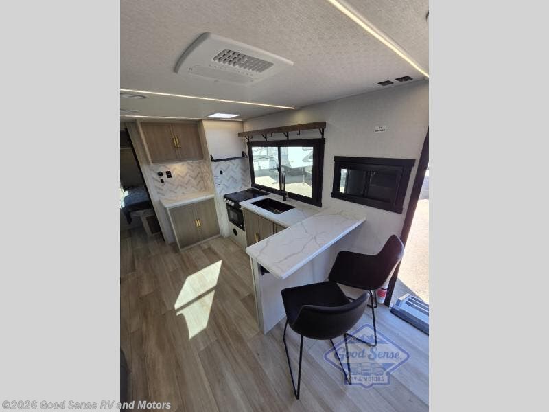 At the front of this well-designed trailer, a private bedroom offers a cozy 60" x 80" queen bed for a restful night’s sleep, complemented by overhead cabinets and a wardrobe for neatly storing clothing and essentials. Moving into the center, a spacious slide-out opens up the living area and houses a comfortable theater seat perfect for lounging after a day of adventure along with a 10 cu. ft. refrigerator and pantry to keep all your groceries and dry goods organized. Across from this space, the L-shaped kitchen provides everything you need to cook your favorite meals, featuring a three-burner range, a residential-style single-bowl undermount sink, and elegant Nordic marble countertops. At the end of the kitchen, a convenient bar top with stools creates a welcoming spot to enjoy meals or unwind with a drink. Toward the rear, the full bathroom adds a touch of luxury with a porcelain toilet, dual sinks, and an LED backlit mirror, allowing two people to get ready comfortably and without the morning rush.
