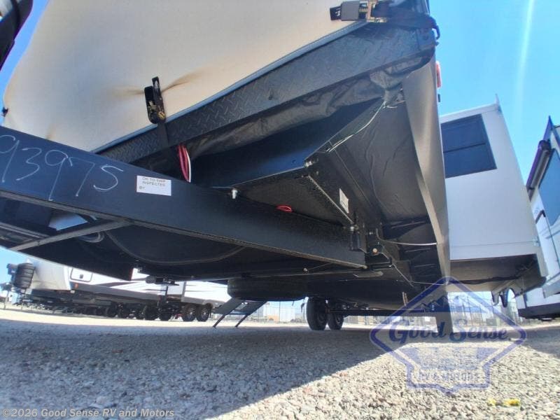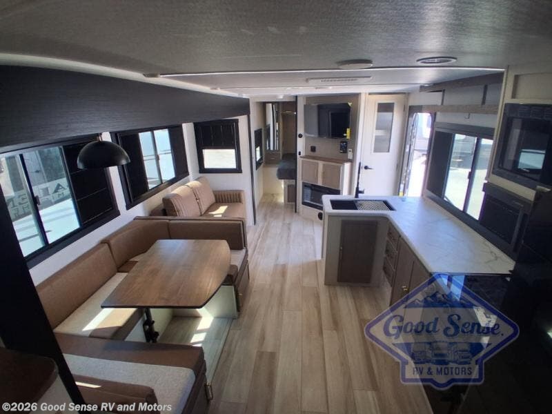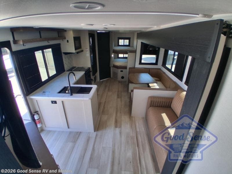 The whole gang will love camping in this bunkhouse model! Since the double-size bunks are right beside the full bath, the little ones can easily use it at night, plus you'll find the second entry door here for added convenience! The combined kitchen and living area includes a U-shaped dinette and tri-fold sofa in great view of the entertainment center with a TV and fireplace. A front private bedroom will provide you with your own space at night, and you're sure to sleep great on the queen bed with Versa Tilt. Head outdoors to enjoy the 20' awning with LED lights and the camp kitchen!