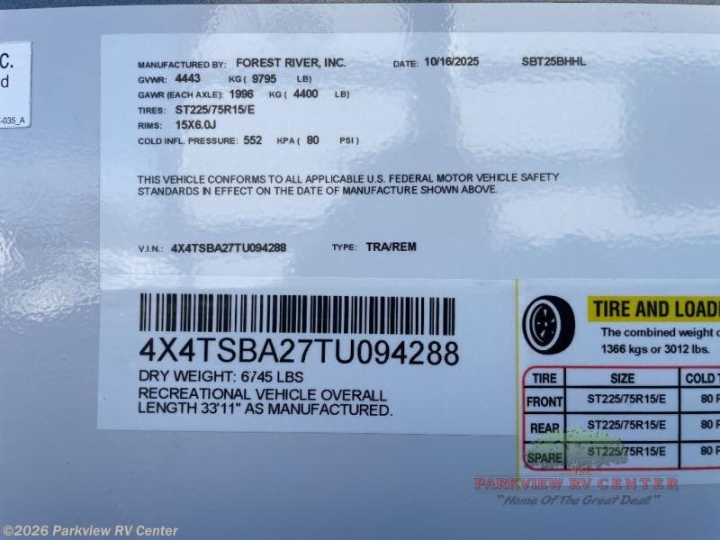 2026 Forest River Salem Hemisphere Hyper-Lyte 25BHHL Specifications