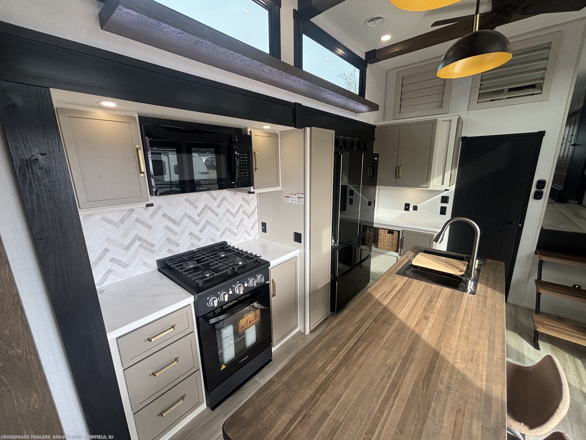 - Modern kitchen: stove top burner, microwave, full-size refrigerator plus 12V refrigerator option, and kitchen island