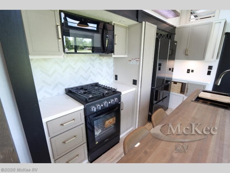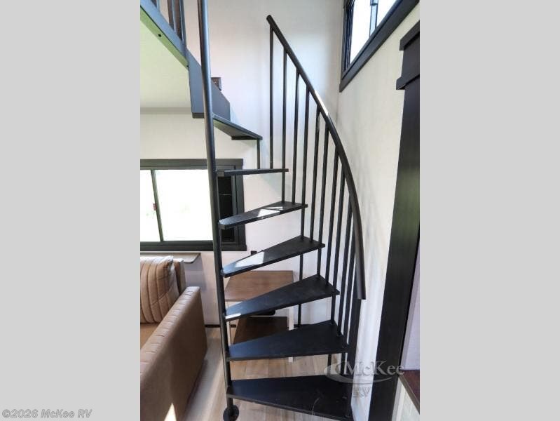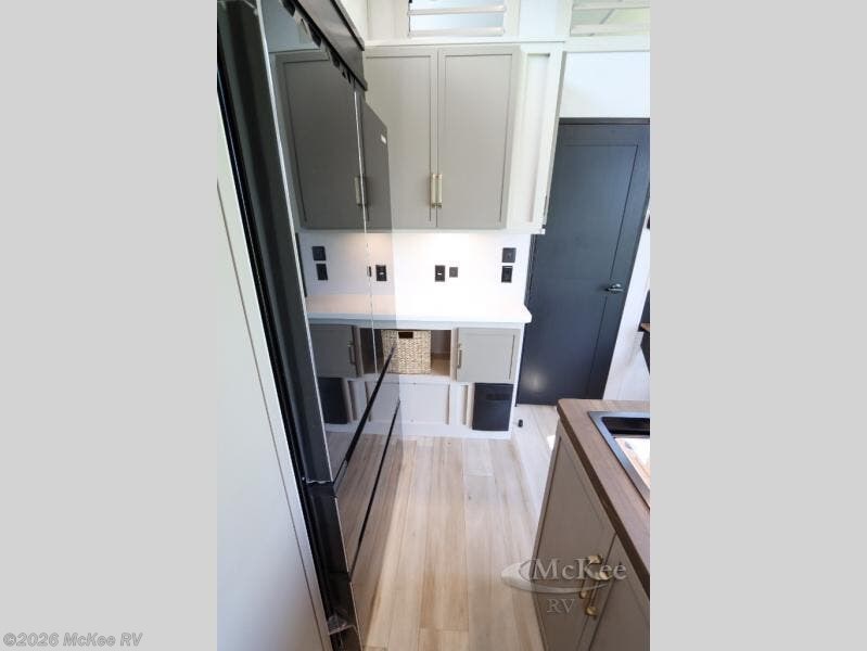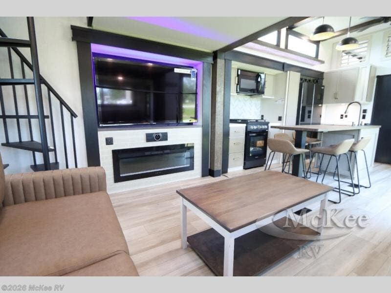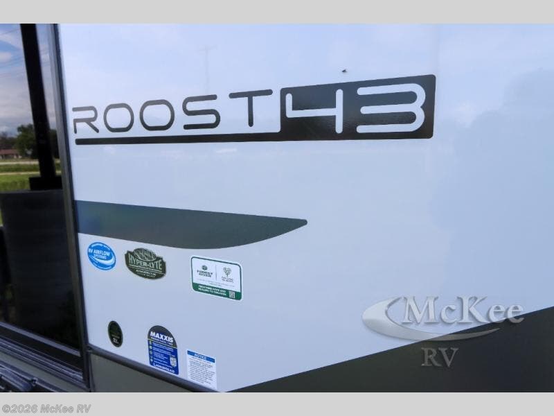 Introducing a new RV of its kind, the ROOST43 is a destination-style fifth wheel you are sure to love! There are two levels, making it feel more like home, and you can sleep six to eight each night. The master bedroom includes a custom king bed slide out, a 32" TV and fireplace, a desk/vanity, plus a half bath for convenience. A custom king-size bed is also found in the front loft, and there are storage cubbies plus a coax/110V outlet here to plug in chargers or a laptop. The second loft in the back includes spiral stairs, two bunk mats, a wardrobe, and cubby cubes here also for your guests' things. Some of the stand-out features you'll find on the first level are the sectional sofa with a coffee table, an entertainment center with a 65" TV, a kitchen island with five chairs, and a fully-equipped kitchen. The 20 cu. ft. 12V refrigerator and pull-out pantry will let you stock up on food, and the kitchen hutch will be perfect for nice dishes. The full bath on this model is one to remember; there is a one-piece fiberglass shower with a teak seat, a flip-up shelf and a washer/dryer, a backlit mirror, and more. And we haven't even touched on the exterior features, such as the pull-out tray, outdoor refrigerators, 20' awning, and more!