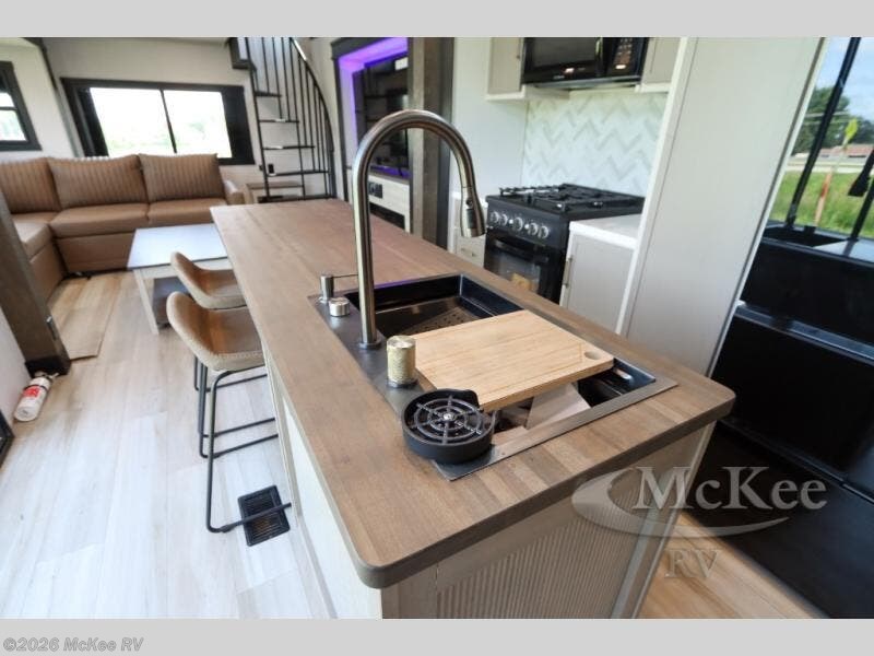 The Salem Hemisphere ROOST fifth wheels resemble a destination trailer that will be giving you residential vibes! The premium Alley Grey high-gloss gel coat fiberglass sidewalls are ultra sleek, and the flat pitched roof sheds water to the off-door side for added comfort. A Race Track A/C duct system provides maximum cooling, and the AccessiBelly underbelly with 12V tank heaters on all holding tanks will help extend your camping season. There are high-end solid surface and maple-stained wood countertops inside, along with residential-inspired wood door casings, and 6' 8" clearance in all rooms, excluding lofts. Additional features include a Gun Metal grey kitchen sink, backlit mirrors in the bathrooms, motion sensor lights by the spiral stair cases, and back up camera prep if you want the option to make parking easier than ever.