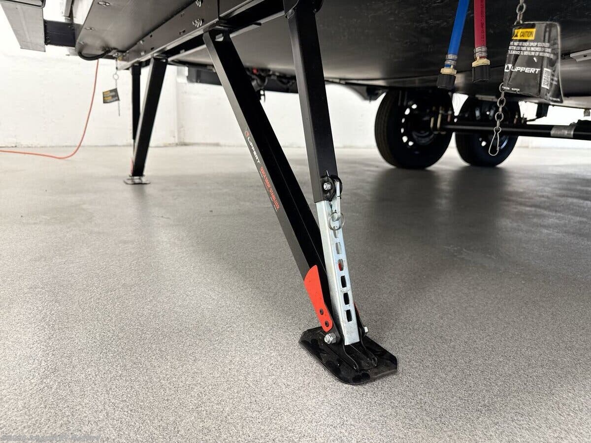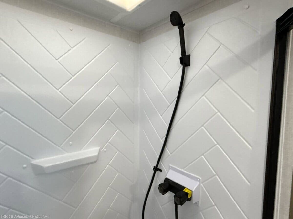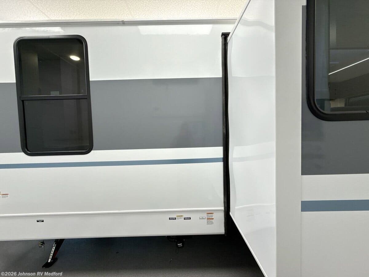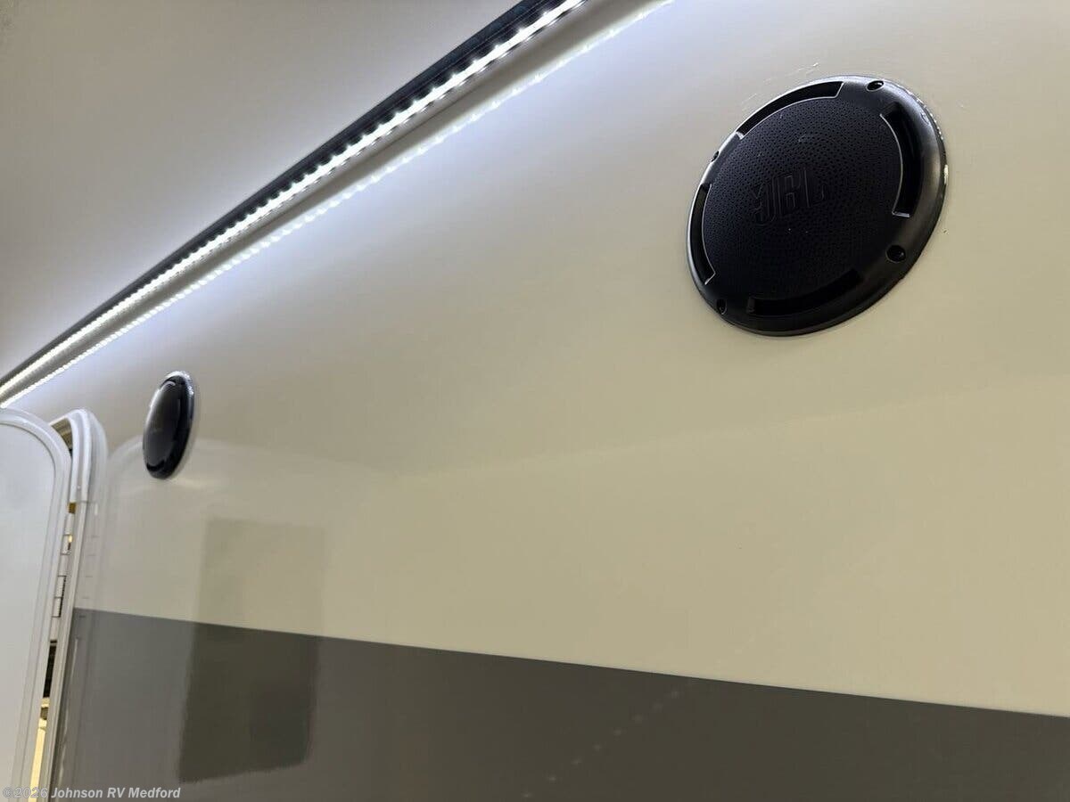 Features Include: Friction Hinge Door, Versa-Flex Desk, Overhead Cabinets, Bar Stools (vbm), Pantry, Single Bowl Sink, Fold-Out Trash Can, Refrigerator, Designer Backsplash, Versa-Range (vbm), Microwave Oven, Systems Center, Backup Camera Prep, USB Charge Ports, WiFi Extender Prep, JBL Stereo, JBL Indoor Speakers, Indoor TV Bracket, JBL Outdoor Speakers, Overbed Storage, Nightstand, Closets, Medicine Cabinet, Backlit Mirror, Vanity Sink, Linen Storage, Shower Skylight, 200w Solar Panel, 30-Amp Service Cord, 13.5k Ducted AC, Cambered Chassis, Aluminum Siding, Front Stone Guard, Pass-Through Storage