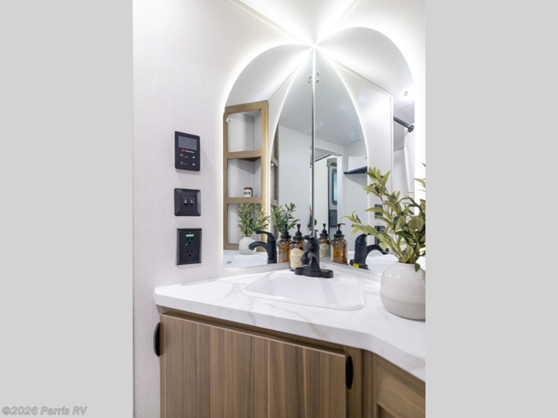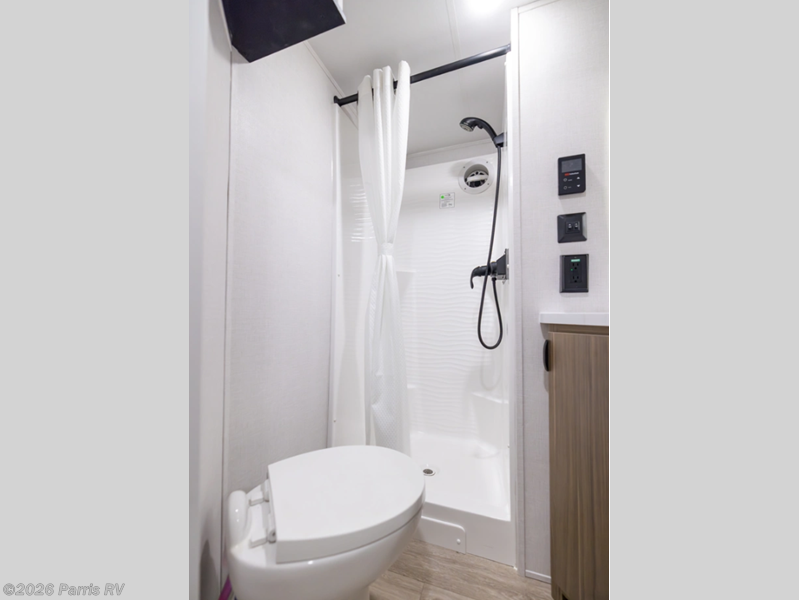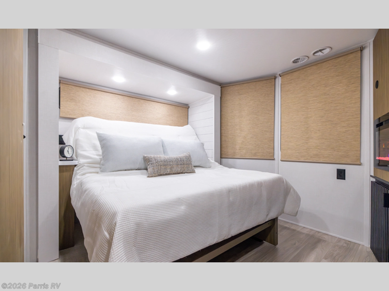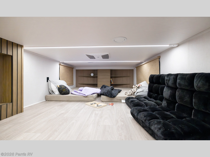 Escape to a life of luxury! The rear bathroom is a spa-like retreat for relaxing in the walk-in shower and storing linens in the closet. The Versa tilt custom King bed is perfect for sleeping like royalty, and the wardrobe/storage combo is great for organizing clothes. The kitchen allows you to keep drinks cold in the fridge, stash gear in the overhead cabinet, whip up quick bites in the microwave, and stock up in the pantry. Gather around the kitchen island for eats and hangs. The L-shaped sofa is a comfy spot to chill, and the entertainment center is perfect for fun nights in, and you can cozy up by the fireplace. A game-changing feature is that the second full bathroom is a refreshing oasis where you can enjoy the walk-in shower. Additionally, the front bedroom's a peaceful sanctuary where you can sleep comfortably on the Versa tilt custom king bed, store gear in the overhead cabinets, and enjoy entertainment on the entertainment center. The dresser is perfect for getting ready. Finally, the loft is a cozy retreat, perfect for sleeping tight on the queen mattress.