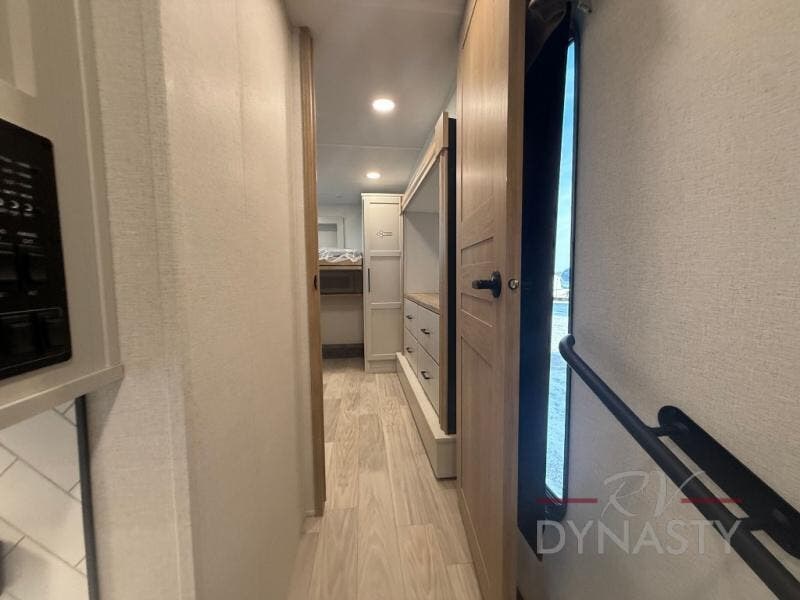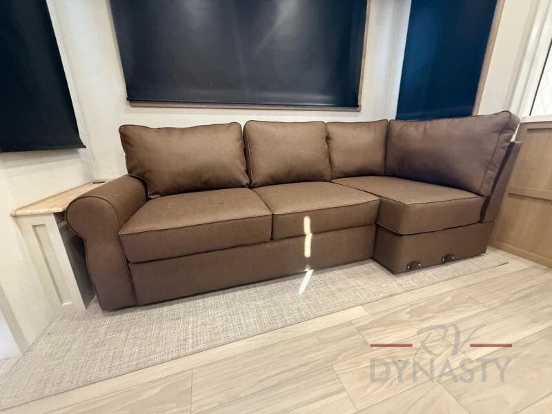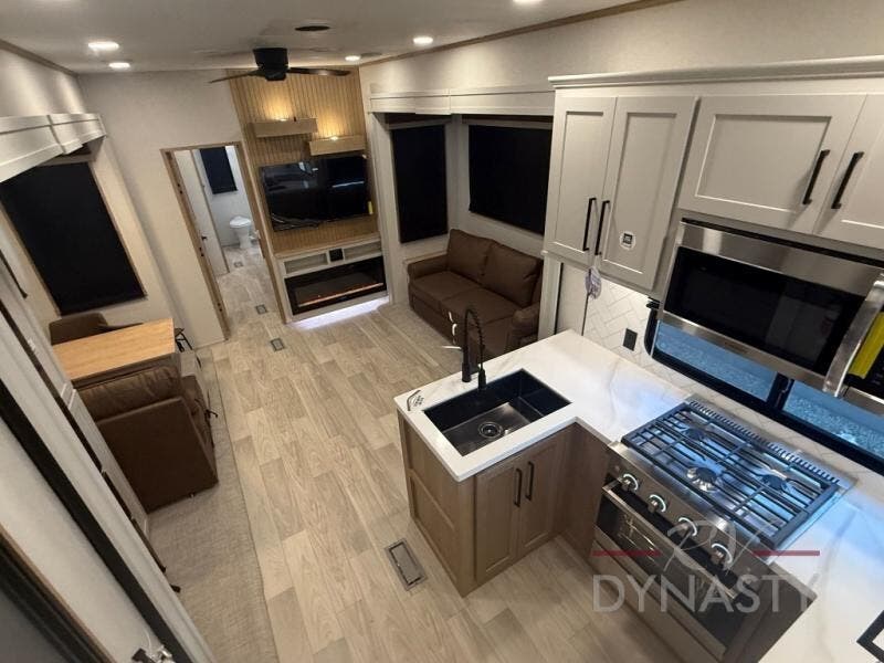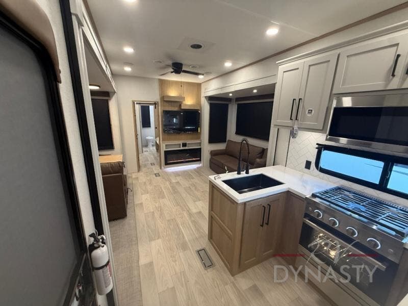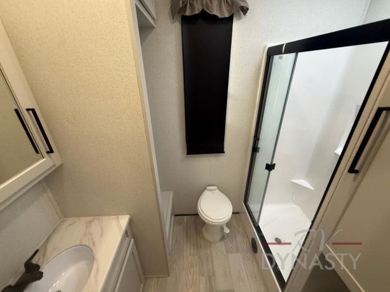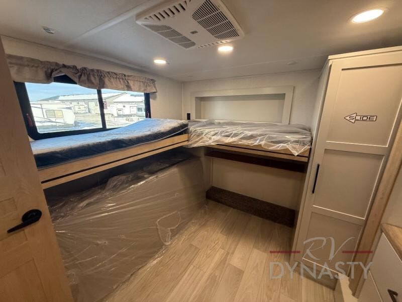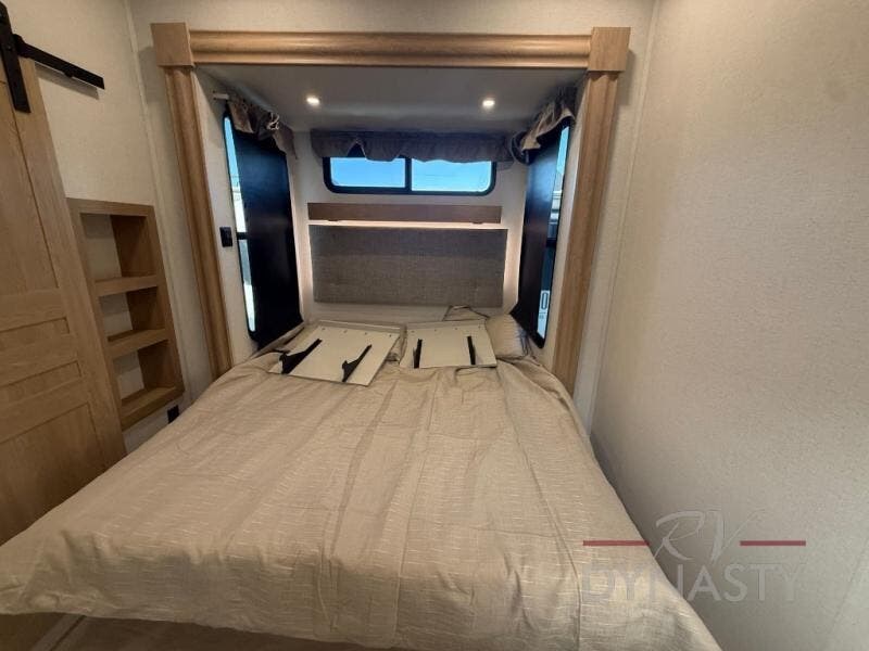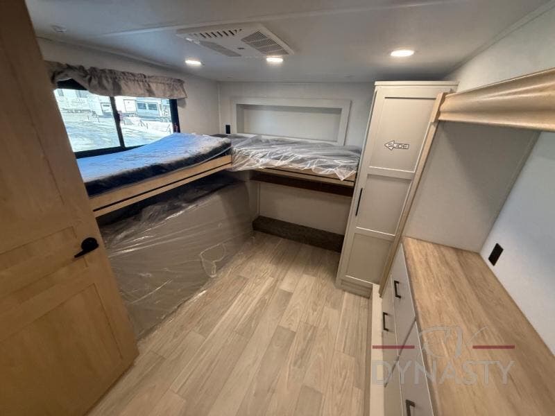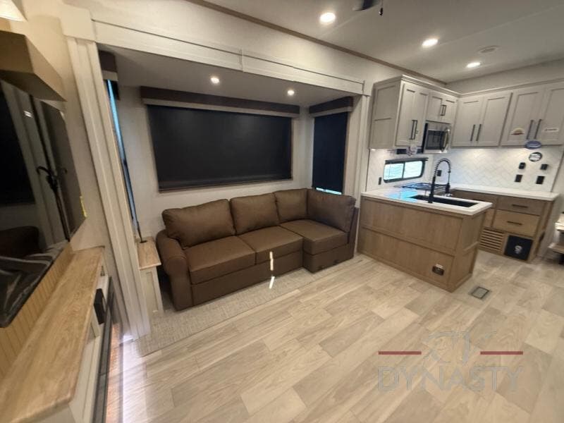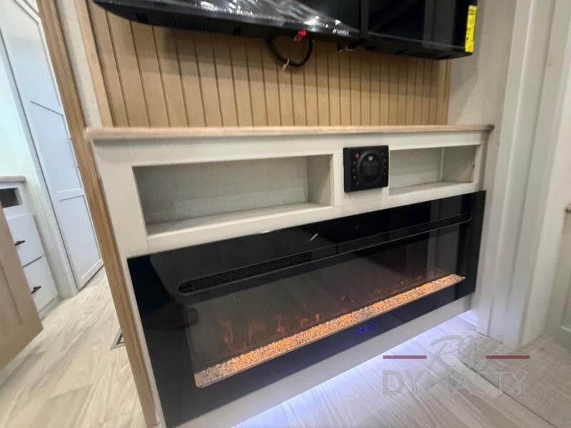 This fifth wheel is thoughtfully designed for comfort and convenience, starting with a spacious front bunkhouse perfect for accommodating guests. It features two flip-up bunks, 28" x 74" and 32" x 74" and a 60" x 74" fold-out lounge, along with a wardrobe, dresser, and additional storage to keep essentials organized. A nearby half bath adds easy access and extra convenience. At the center of the unit, the kitchen offers everything you need to prepare meals, including a stainless-steel sink, three-burner cooktop, and a generous 16 cu. ft. refrigerator. Meals can be enjoyed at the free-standing dinette, or you can unwind on the sectional sofa while enjoying the fireplace or entertainment center. At the rear, you'll find the private main bedroom with a roomy 66" x 80" RV king bed, plus its own wardrobe and dresser. Just steps away is the full bathroom featuring a one-piece fiberglass shower, sink with medicine cabinet, linen storage, and even washer/dryer prep for extended stays.